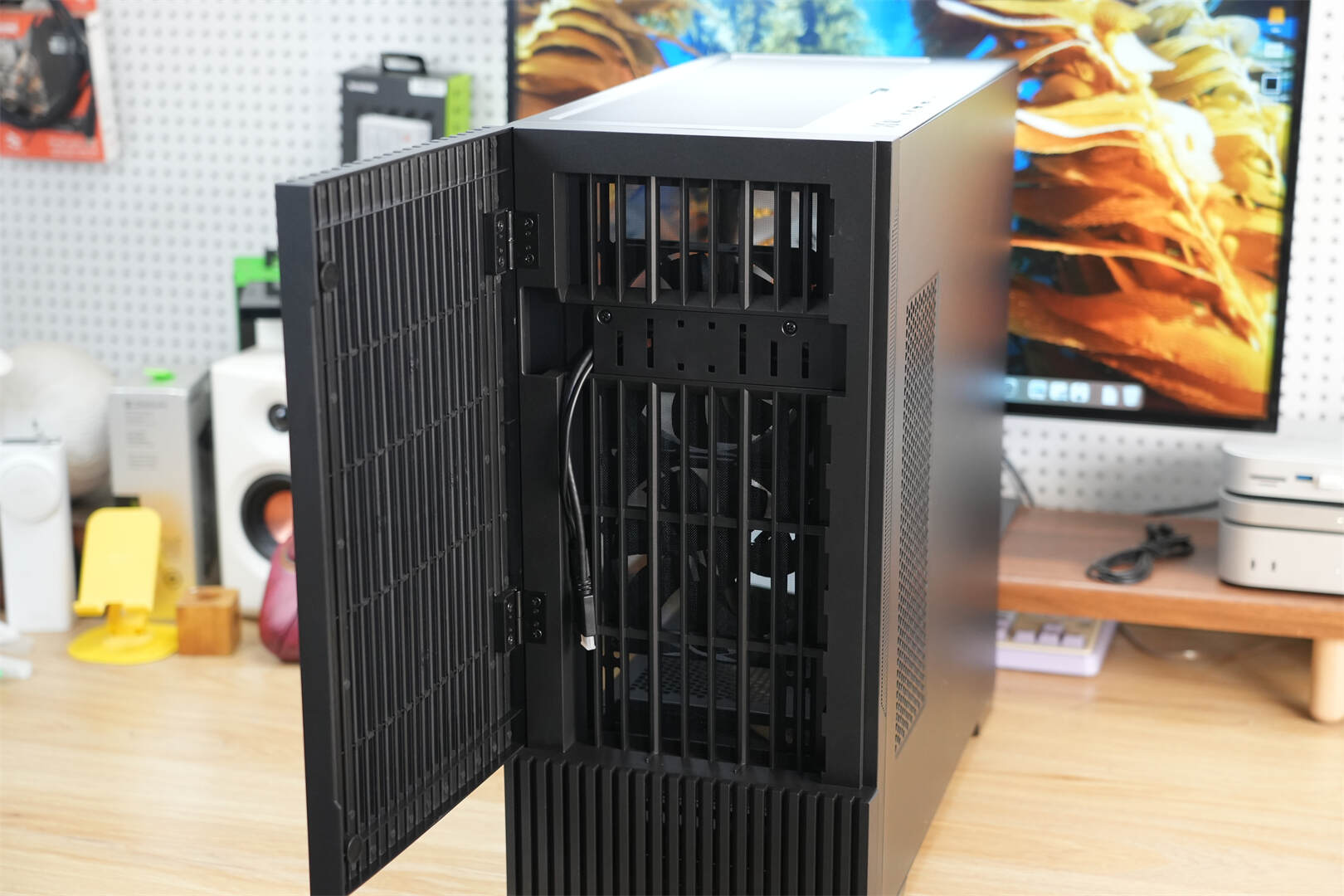 机箱右侧采用手拧螺丝固定的铁皮挡板设计,便于快速拆装维护;前端区域配备蜂窝状散热孔,精准对应双风扇安装位,同时前面板隐藏式长梯形开孔形成辅助进气通道,优化整机气流循环效率。