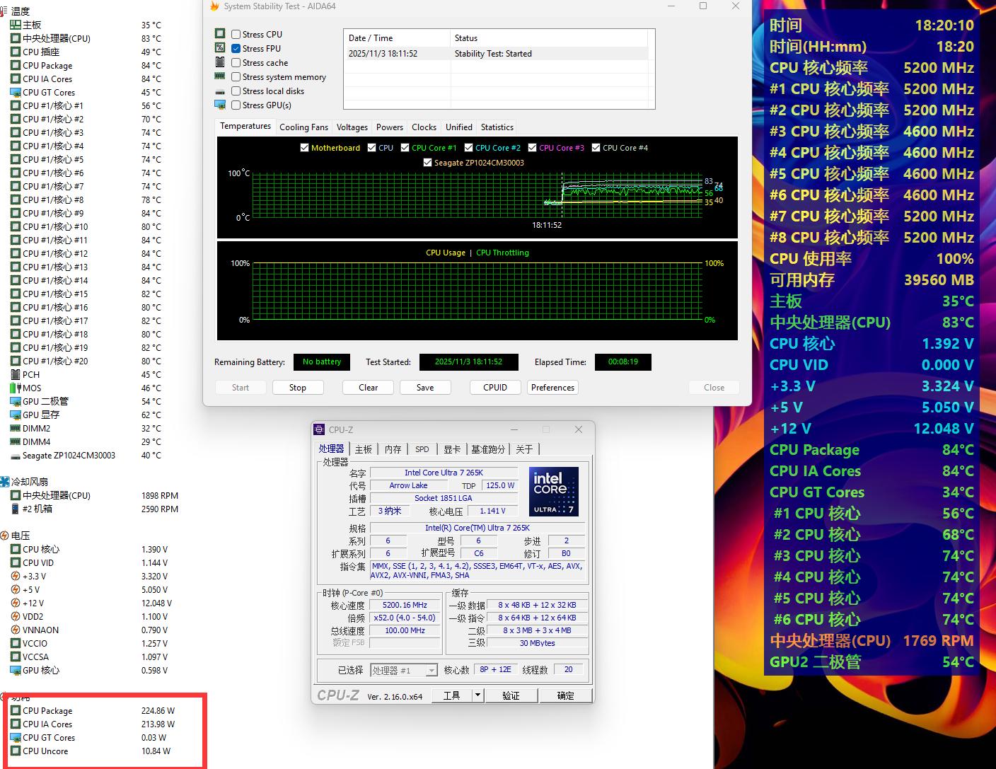 AIDA64 FPU烤鸡8分钟,功耗224W,温度只有83℃,所以说这款思民ALPHA2 A36水冷完全可以应付高功耗的处理器。