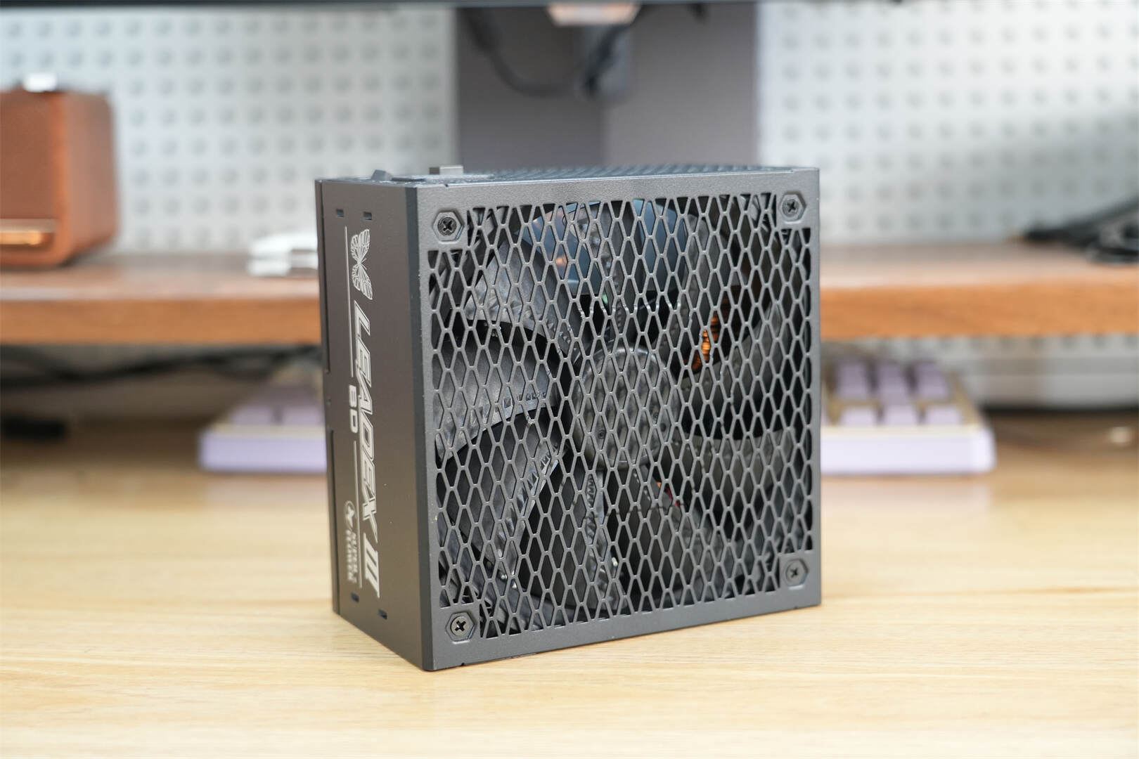 电源背面除电源接口及其开关外,还有一个ECO模式开关。通过开关可切换ECO和AUTO两种散热方式:打开ECO按钮为ECO模式,该模式下风扇在<45负载时完全停转,随温度/负载升高自动启动;关闭ECO后进入AUTO模式,电源实时监测负载智能调节转速,高负载加速散热,低负载保持低速运转。