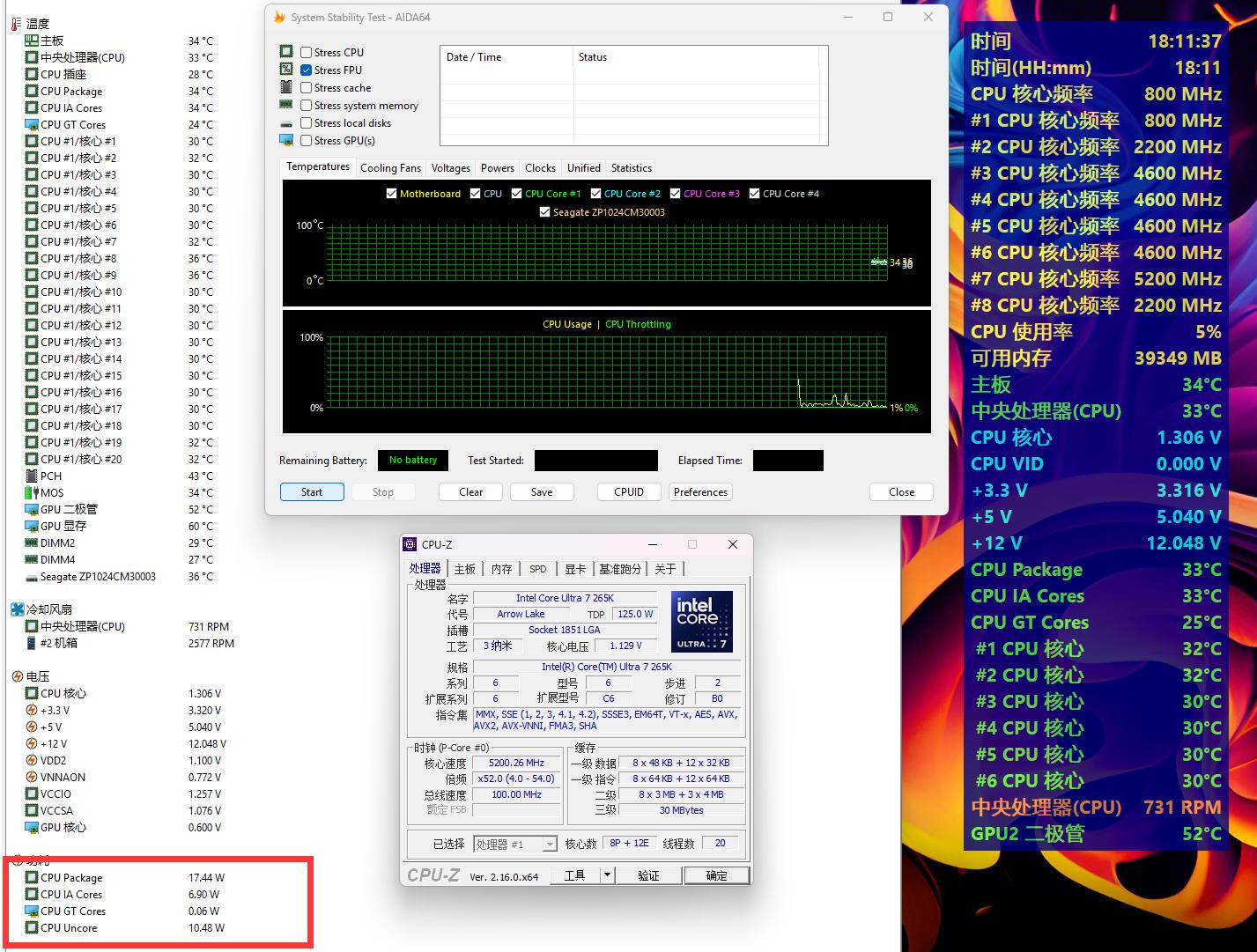 使用的散热器是新款思民ALPHA2 A36水冷,来看看它的日常待机,处理器温度仅有33℃,核心温度在37℃上下波动,功耗为17W,这个温度我很满意。