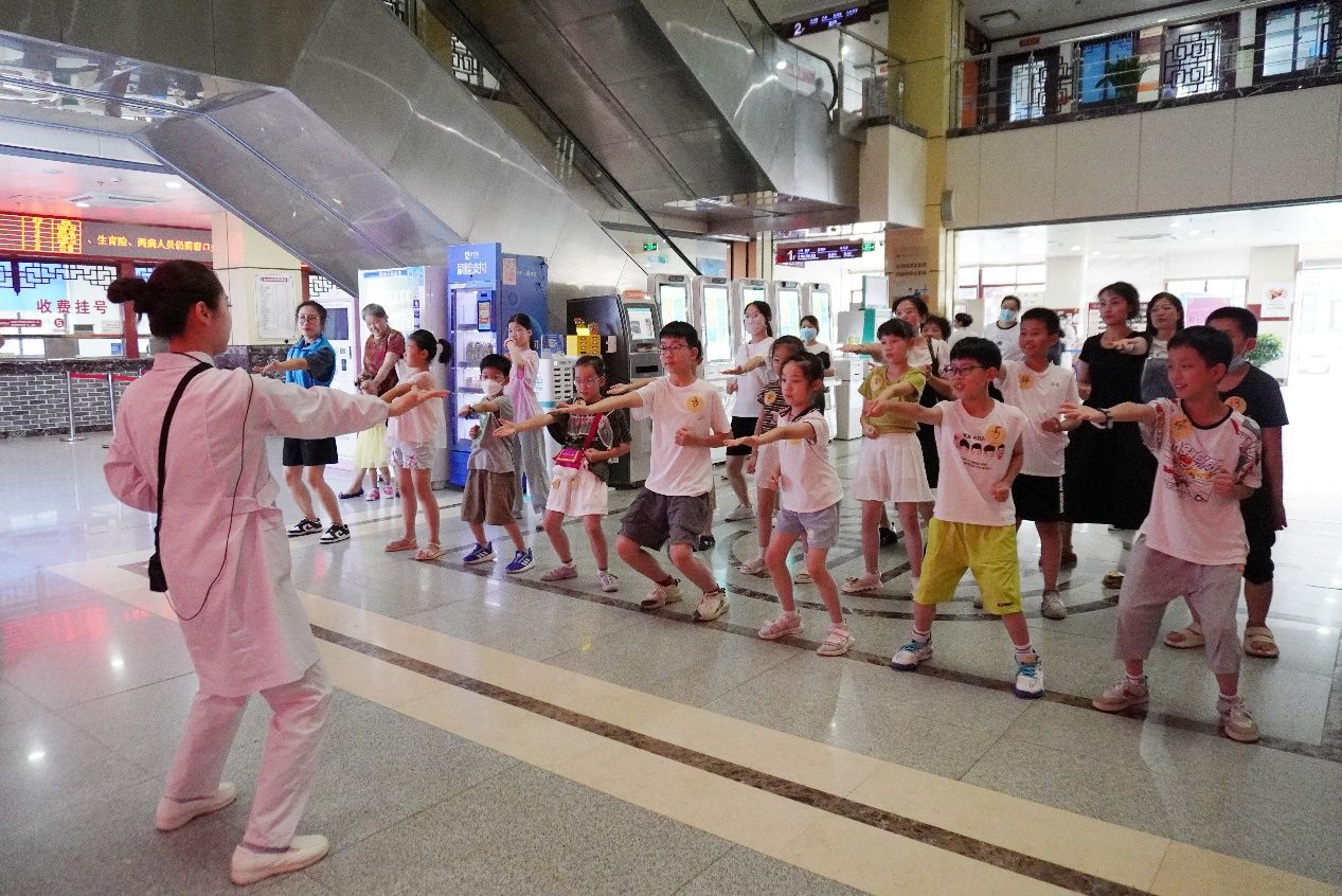 在中医院门诊大厅,学生和家长们看到中医院的护士小姐姐正在教学八段锦,大家便一起加入,瞧,个个学得有模有样!