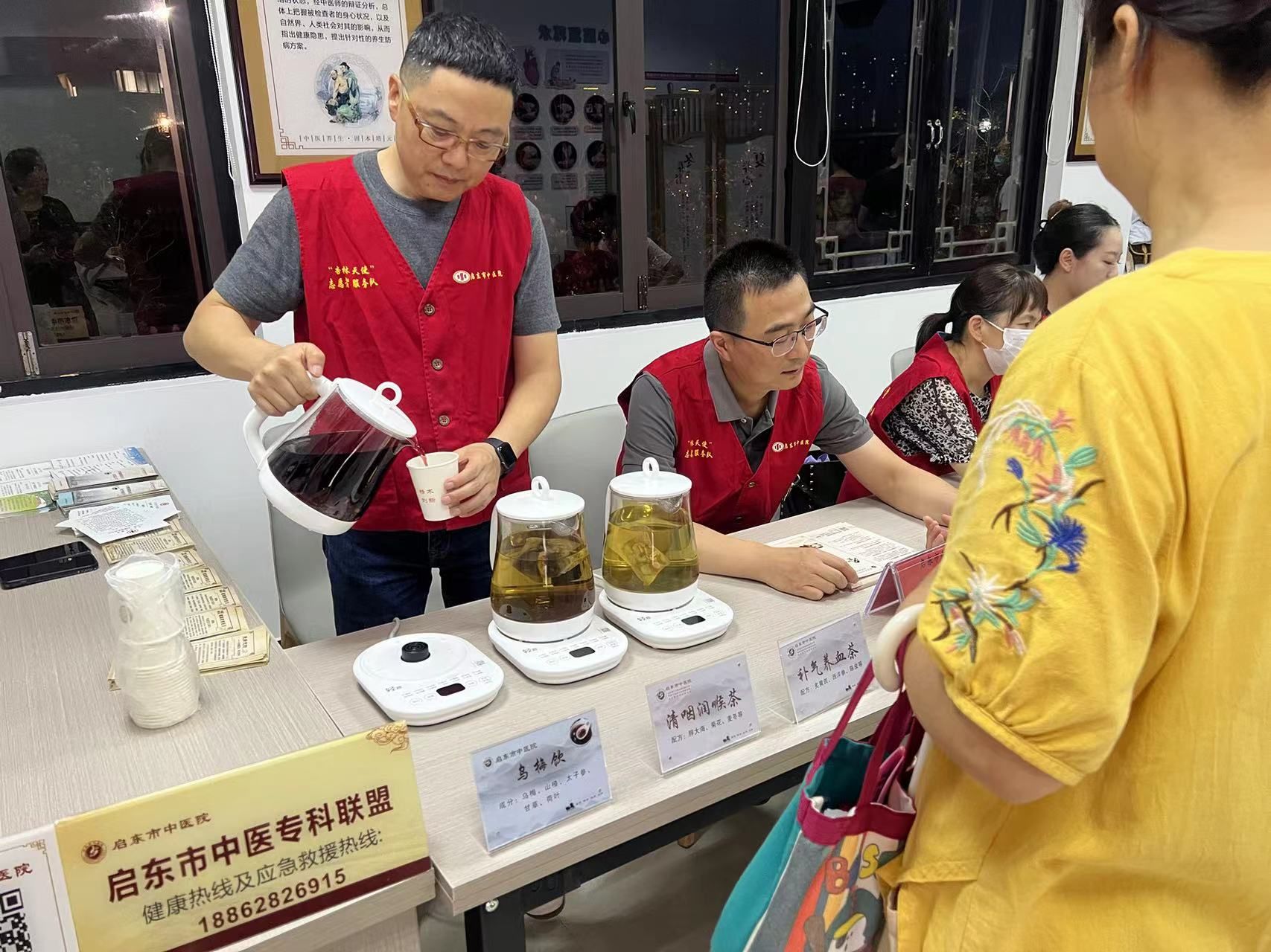 活动现场,医疗小组还会给大家免费派送医院特制的中药香囊,大家一边询问香囊功效一边有序排队领取;中药茶饮免费品尝区,大家拿着一次性杯子一一品尝;还有部分居民跟着医护人员练起了八段锦。