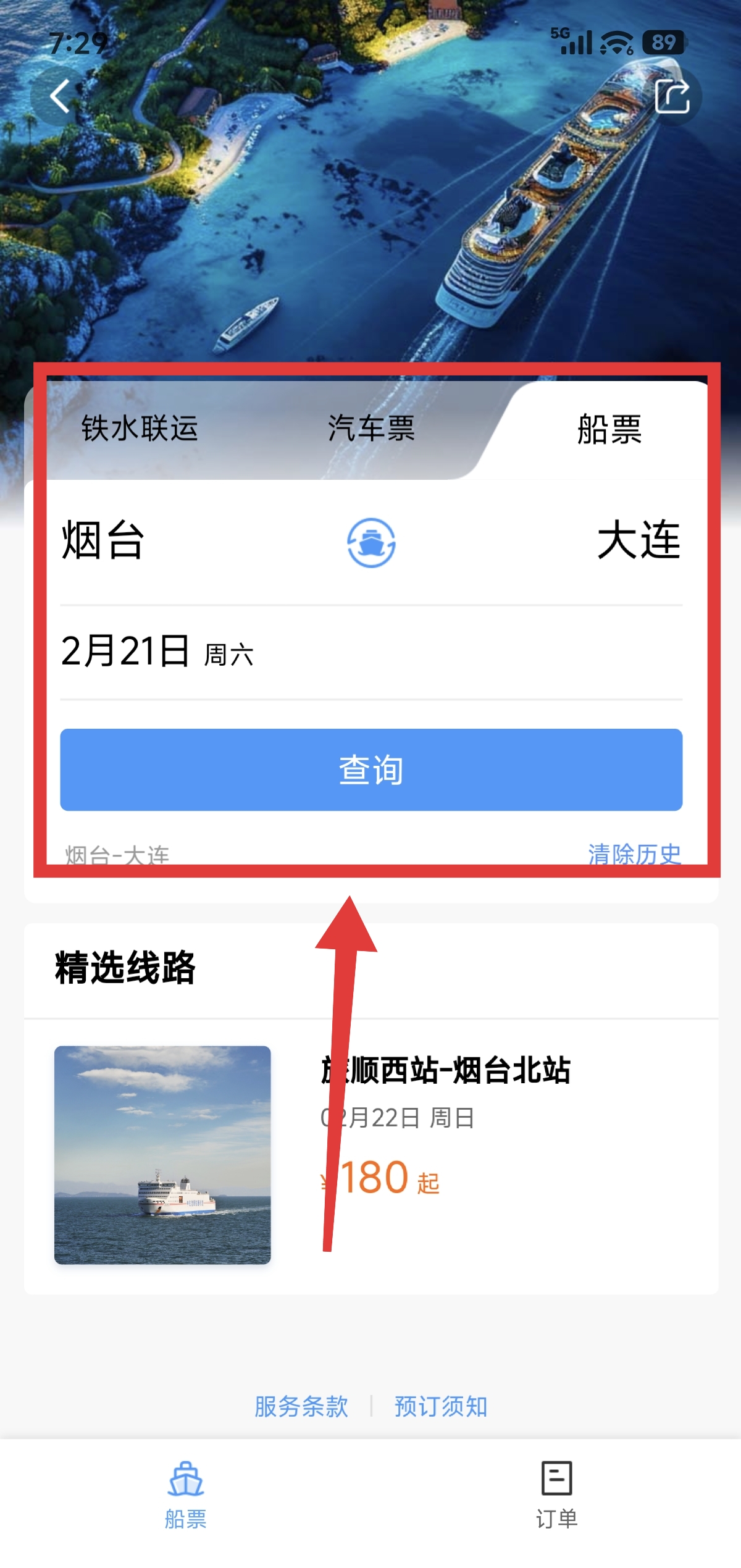 3.进入到船票页面后,输入(出发地和到达地),然后点击(查询)按钮即可查询购买船票了。