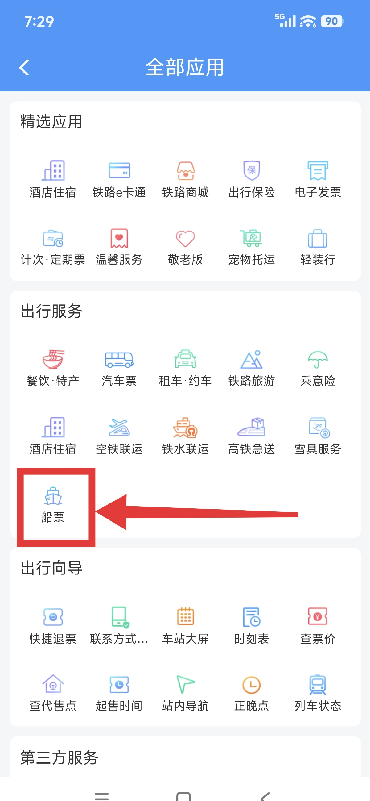 首先进入到主页面后,用手指向左滑动进入(全部应用)。2.进入到全部应用页面后,点击【船票】。3.进入到船票页面后,输入(