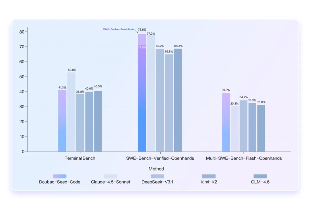 Doubao-Seed-Code 专为 Agentic 编程场景深度调优,在 Terminal Bench、SWE-Bench-Verified-Openhands、Multi-SWE-Bench-Flash-Openhands 等权威榜单全面领跑,成绩稳居国内第一梯队。