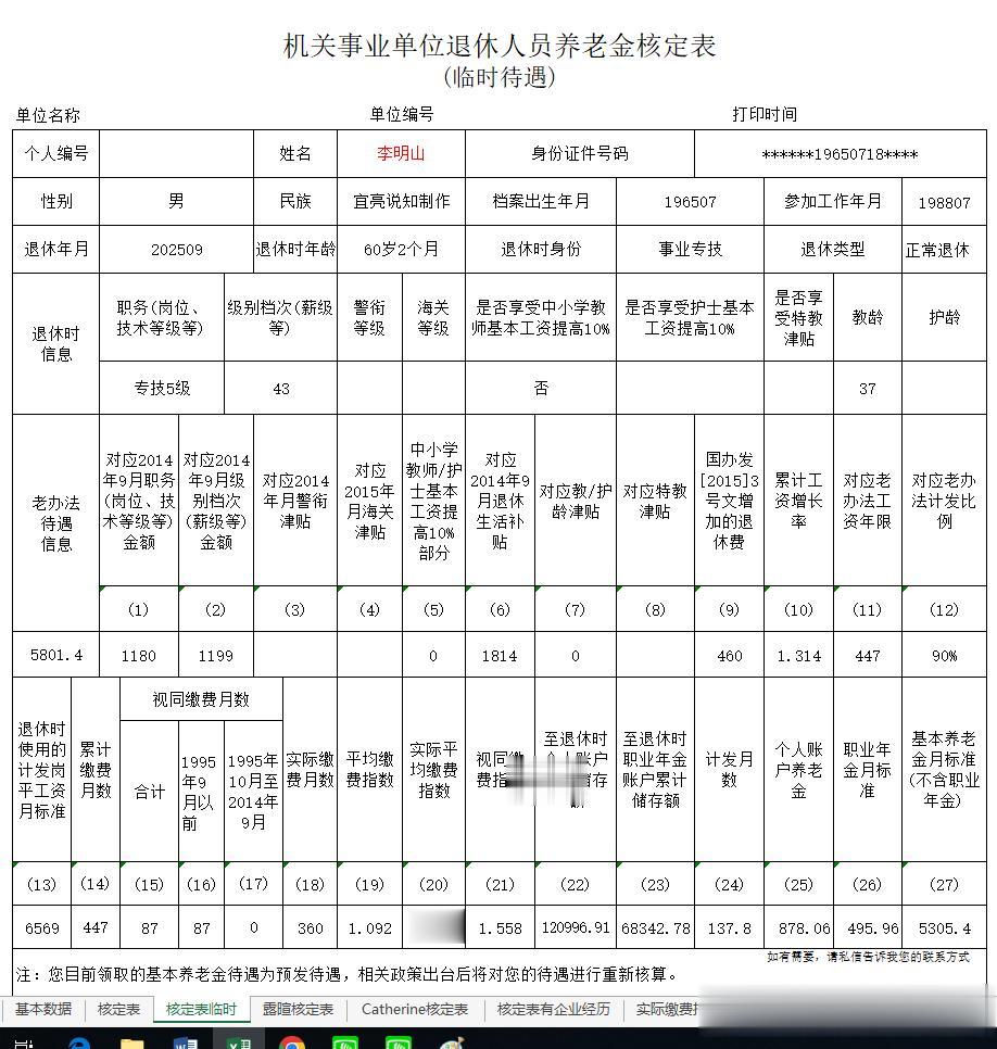 下图为笔者复核李先生养老金时,将所需参数录入《基本数据》工作后,在《核定表临时》工作表中,更换李先生的姓名后,自动生成的数据:请您核对