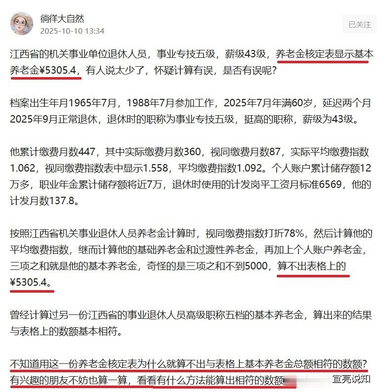 1、在网上看到我的朋友徜徉大自然展示的一张预发养老金核定表,她不明白那个基本养老金5305.4元是如何计算出来的。她问有什么方法能算出相符的数额?见下两个图表: