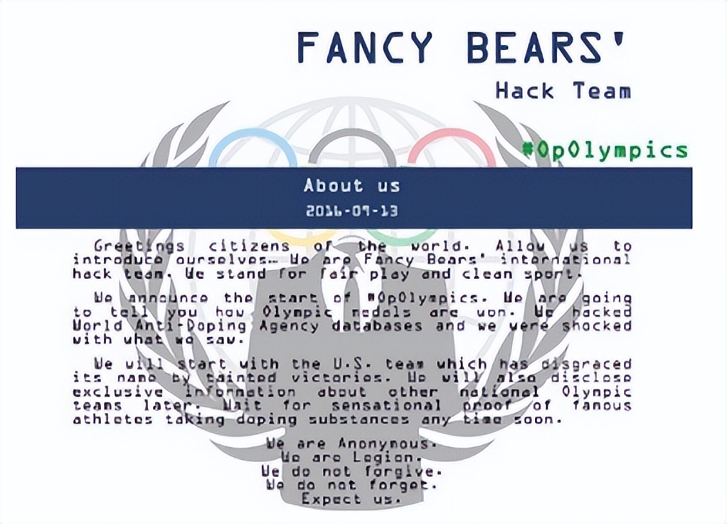 图5. 2016年世界反兴奋剂机构遭黑客攻击后,“奇幻熊”的网站界面(图源于CSIS报告,如有侵权请联系删除)