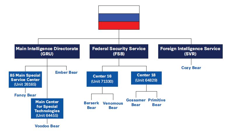 俄罗斯俄罗斯在网络领域既依靠国家情报/安全机构开展工作,也动用一些民间网络力量。在政府体系中,没有任何一个专门的俄罗斯安全或情报机构对网络作战负有完全责任。观察人士指出,俄罗斯各网络单位之间的协调很弱。这种体制“导致各机构在资源、人员和影响力上相互竞争”,也有时导致其在毫不知情的情况下各自开展类似行动。俄罗斯总参情报总局(GRU)、联邦安全局(FSB)和联邦对外情报局(SVR)内部都设有实力强劲的进攻型网络单位,通常是高级持续性威胁(APT)组织,只是其作战手法和技术水平有所差异。下文将对这三大俄罗斯网络相关机构进行介绍。在下文中,所谓以“熊”命名的高级持续性威胁组织,系指CrowdStrike公司所采用的系列代号;这些组织在业界还存在其他别名。
