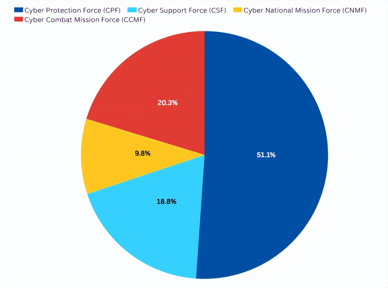 网络国家任务部队(CNMF):共13支队伍,主要任务是开展网络作战,以保护国防部信息网络和国家免受恶意网络威胁。网络作战任务部队(CCMF):共27支队伍,主要任务是开展军事网络作战,并支援各作战司令部(如美国非洲司令部、印太司令部和战略司令部)所制定的任务、计划和优先事项。网络保护部队(CPF):共68支队伍,主要任务是保护国防信息网络并协助网络作战部队做好战斗准备;这一任务通过内部网络作战来完成,即保护国防信息网络或其他蓝军网络空间。网络保护部队包括隶属于联合部队司令部的国家级力量、隶属于各作战司令部的队伍,以及隶属于各军种网络司令部的队伍。网络支援部队(CSF):共25支队伍,主要任务是为网络国家任务部队和网络作战任务部队提供分析和规划支持。