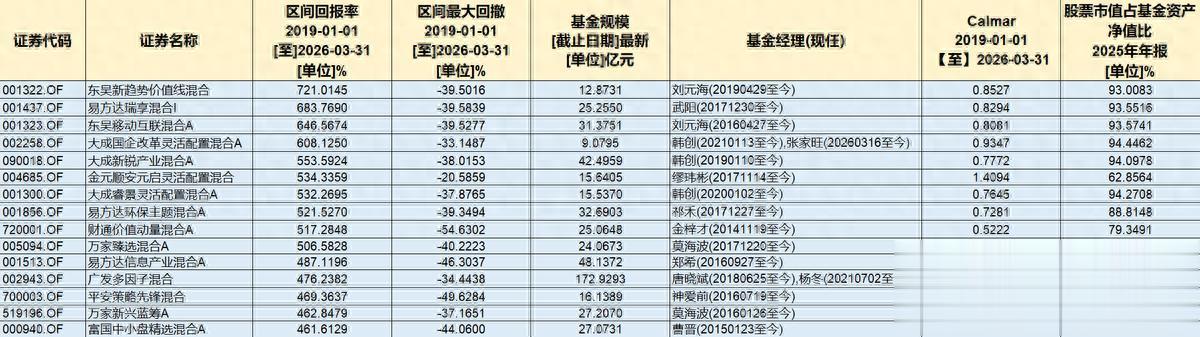 本文从全市场偏股型基金中,筛选出2019年1月1日至2026年3月31日期间,兼具卓越卡玛比率(Calmar Ratio)与绝对收益的15只主动权益基金,并对其进行评述。