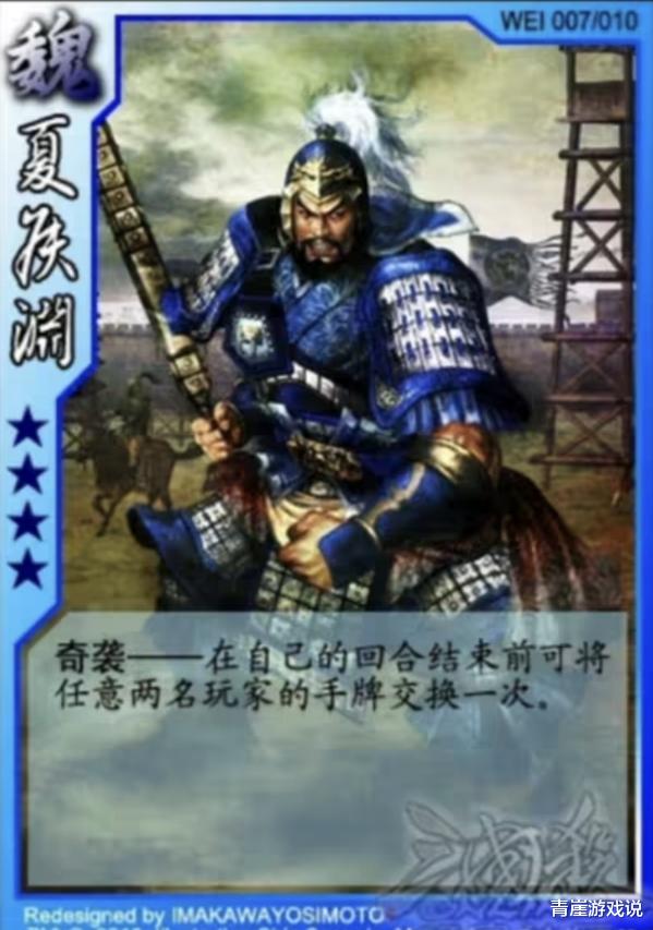 最初版本的夏侯渊技能是【奇袭】,交换两名角色的手牌。这技能强度超高,和【缔盟】相似,但要注意夏侯渊的技能没代价!只要夏侯渊发动【奇袭】,就能给团队带来超高收益!作为早期武将,夏侯渊是绝对的超标!