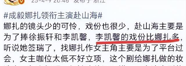 知情人透露,李凯馨虽然顶着 “女二” 头衔,戏份却比女主娜扎还多,和成毅的 CP 线更是贯穿全剧,甚至有人怀疑娜扎只是 “招商工具人”。