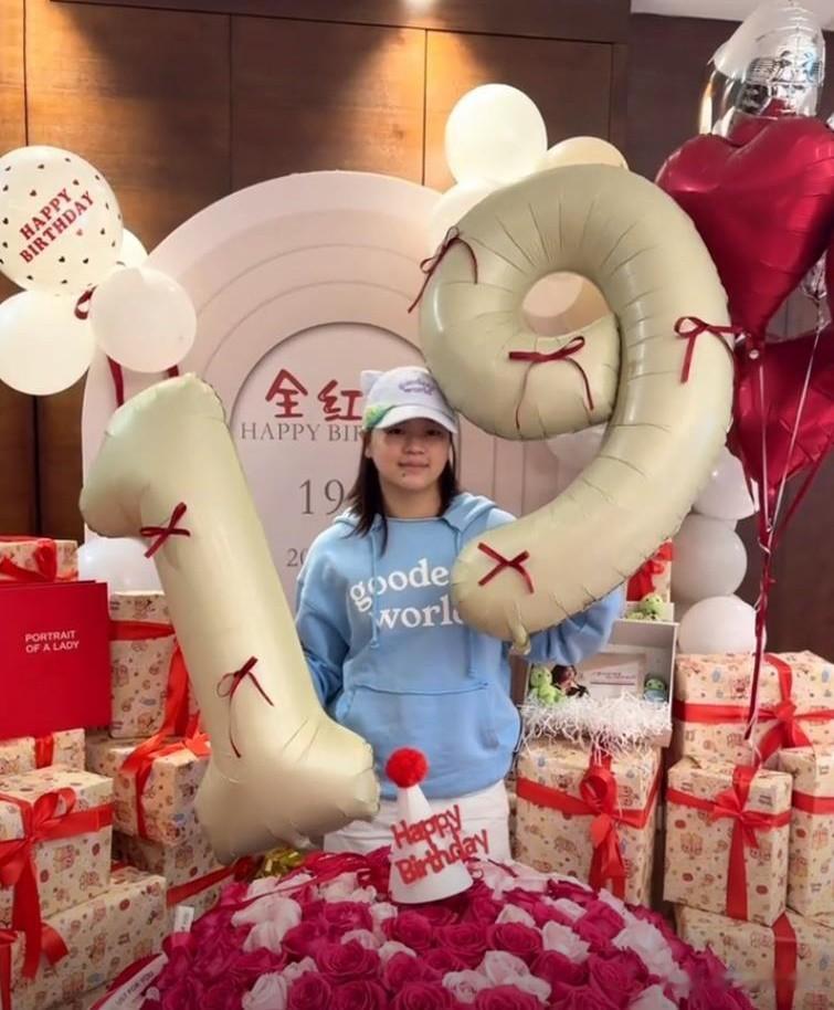 聚会现场布置很漂亮,堆满了礼盒和大朵玫瑰花,氛围浪漫又喜庆。全红婵衣着时尚,化了精致的妆容,接受朋友们的祝福。朋友们纷纷跟全红婵合影,围着大大的生日蛋糕齐唱生日歌,展现了跳水梦之队的深厚情谊。