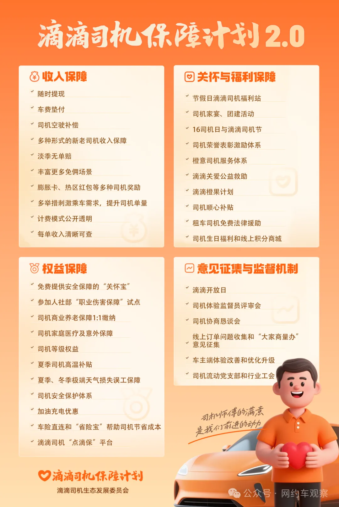 “橙意保障计划”升级为“滴滴司机服务计划”,在关爱公益救助、健康就医补助、出车关怀补助、出行分保护卡等方面给予保障。