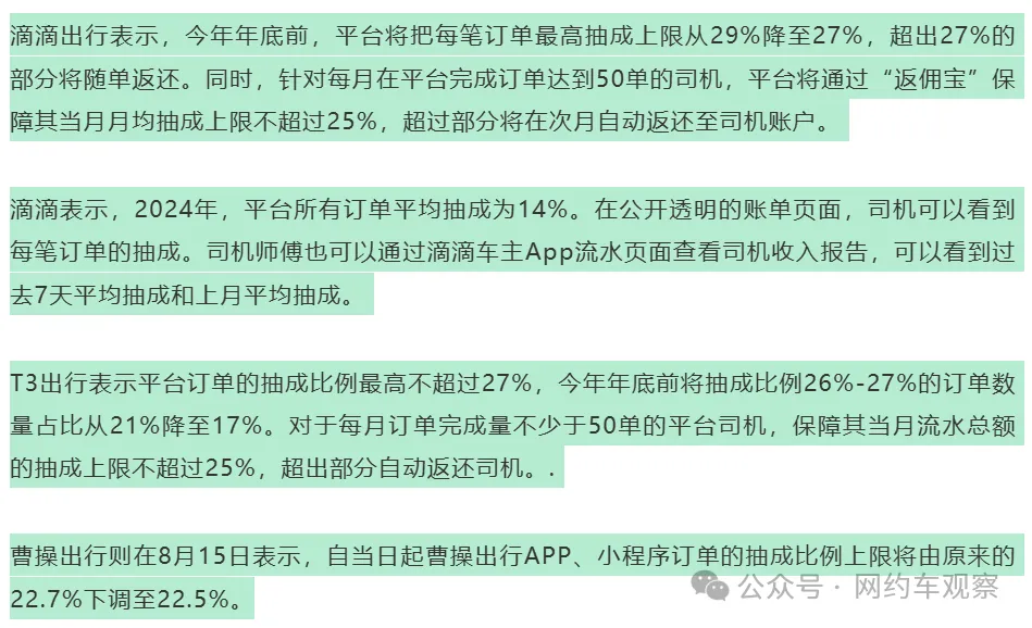 2024年,滴滴平台网约车订单平均抽成为14%,同时推出“返佣宝”收入保障计划。每月在平台完成订单达到50单的司机,通过“返佣宝”保障其当月月均抽成上限不超过25%,超过部分将在次月自动返还至司机账户。