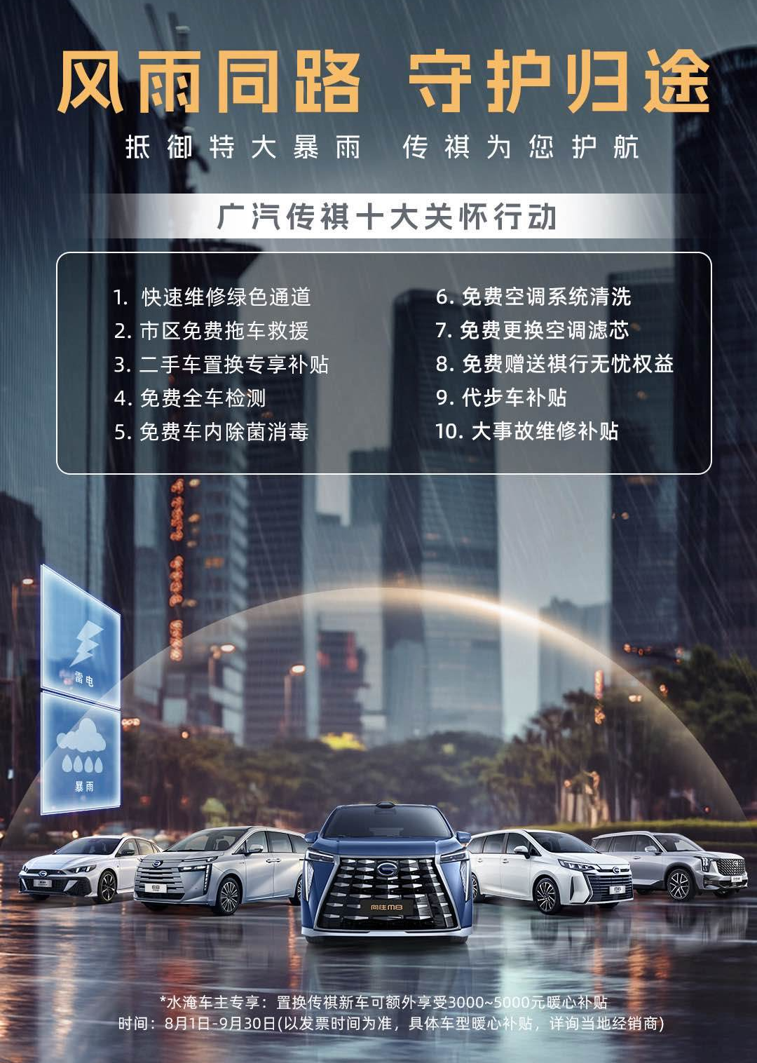 此外,广汽传祺还针对水淹车主,提供置换新车专享礼遇:置换传祺品牌新车,可享3000~5000元暖心补贴(8月1日-9月30日期间,以发票时间为准),尽显关爱。