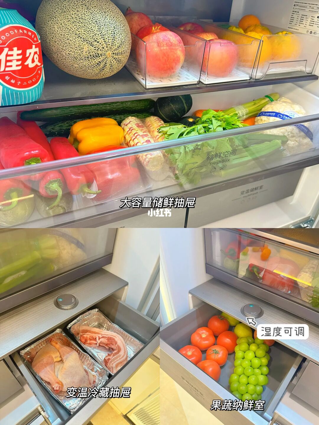 这个冰箱还带了一个独立的变温控湿冷藏抽屉,抽屉内的温度三档可调,可以选择不同的温度保存冰鲜、冷饮或果蔬 ,左边的果蔬纳鲜室能够调节湿度,选择高湿或低湿可以分别存放有不同湿度需求的食材