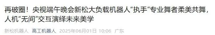 新华社连续刊发《人机“执手”柔美共舞 新松新款大负载工业机器人亮相端午晚会》、《机器人助力幸福生活|这只“变形金刚手臂”成舞林高手》、《在刚结束的2025央视端午晚会上,这只“大手”火了》、《在“大手”机器人上跳舞是什么感觉?》四篇报道,引发全网转载,累计总阅读量/点击量超300万;人民日报以《刚柔并济!机器人与演员共舞,演绎未来美学》为题,讲述新松在技术创新领域多年深耕,人民网《端午晚会再现人机共舞,这只“大手”来自沈阳新松》,强调新松机器人如何让科技与艺术完美融合;工人日报则聚焦《晚会上,机器人与专业舞者翩翩起舞》,深挖新松工业机器人SR270A-270/2.70的技术亮点;中国电子报《新松大负载机器人亮相央视端午晚会》,以节目为出发点,全面解读工业设备如何跨界成为“舞台艺术家”;辽宁电视台、辽宁日报、沈阳日报、沈阳晚报等地方媒体三天来针对新松机器人原创刊发超20篇报道,从产品特性、技术创新到地方产业升级等多个角度,深入解读新松如何代表“东北智造”走向全国,成为中国科技的一张亮丽名片。
