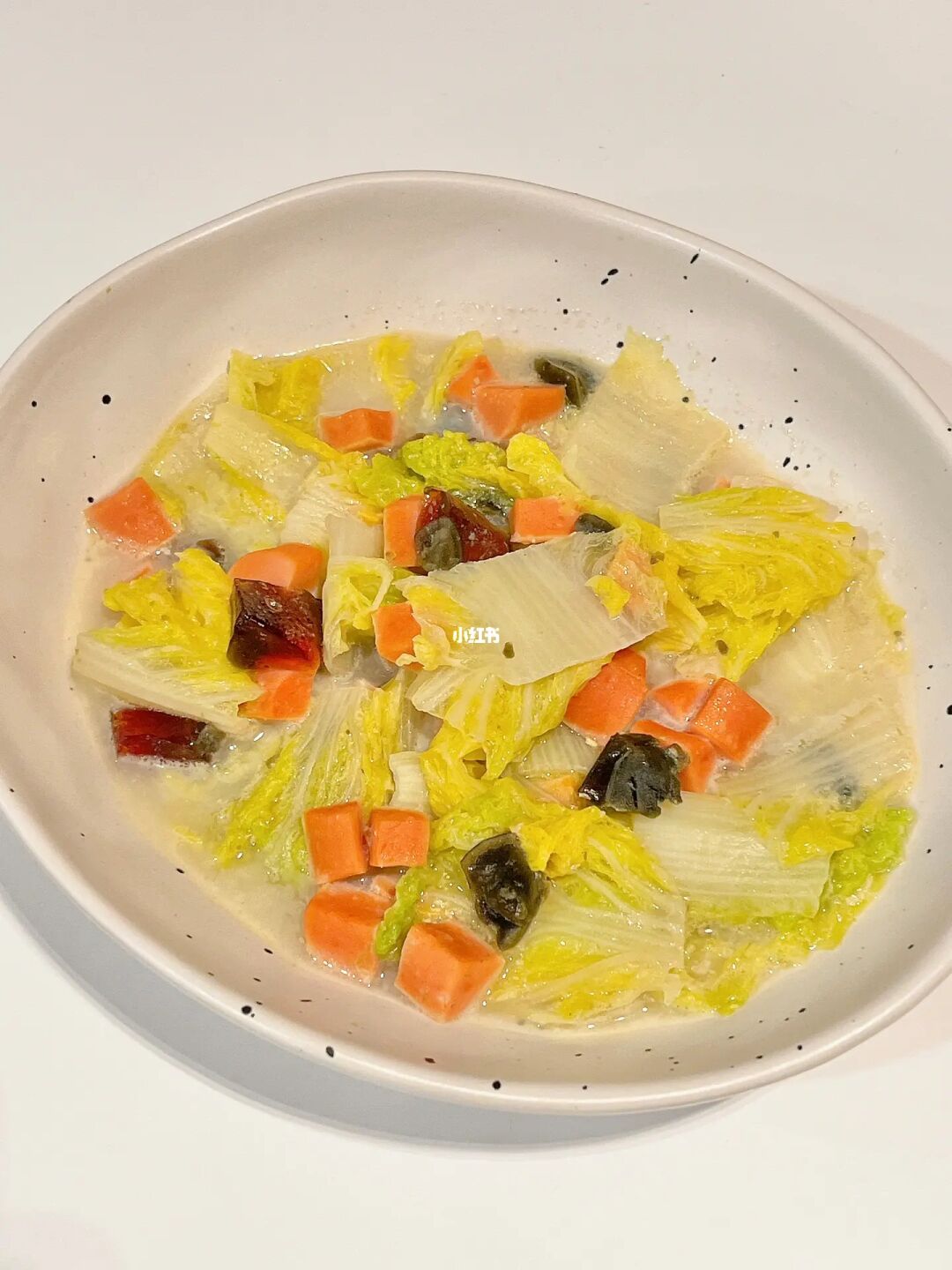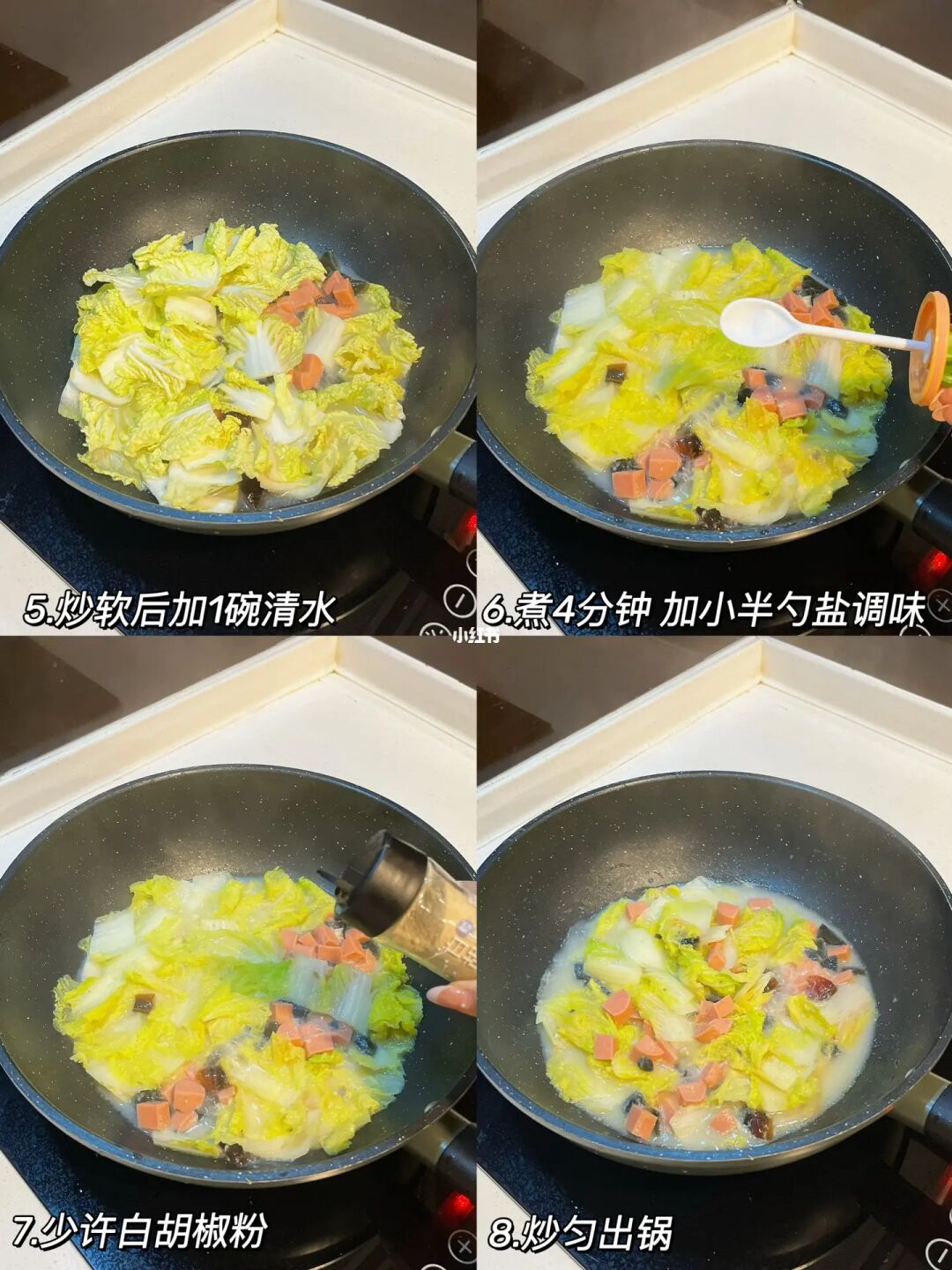 [三R]放娃娃菜炒软后加一碗清水,盖盖煮4分钟左右加1小勺盐和少许白胡椒粉调味出锅