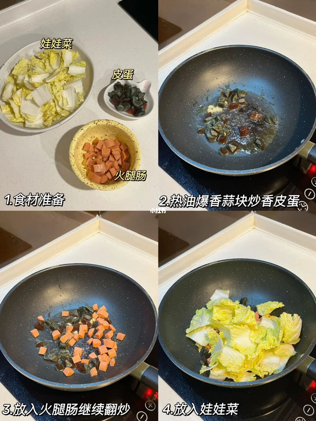 食材准备:娃娃菜 皮蛋 火腿肠 蒜