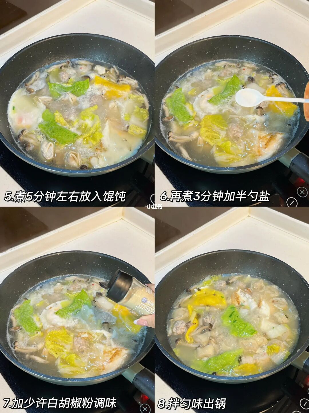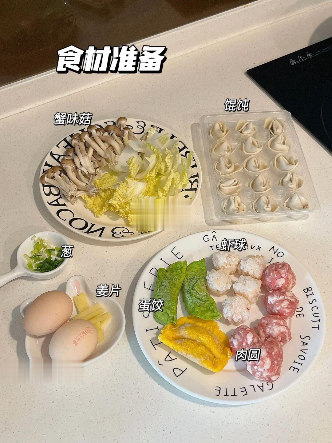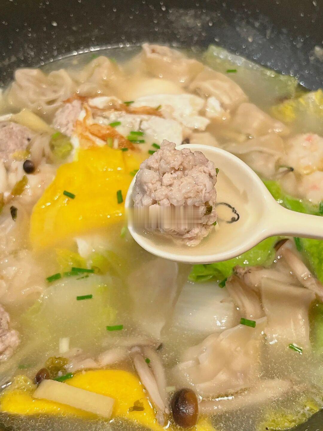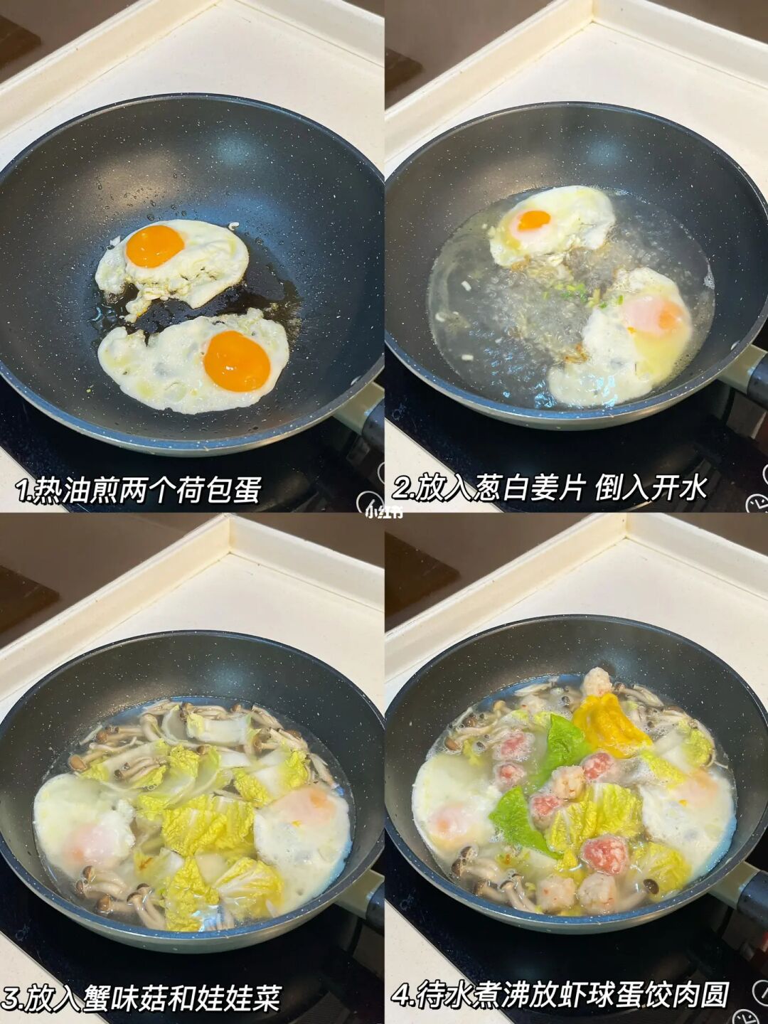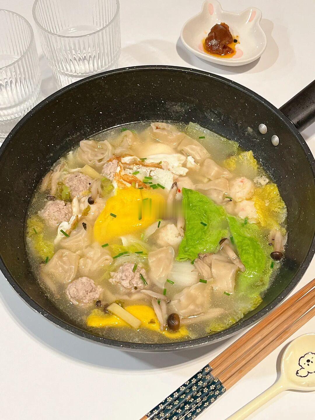 咕噜咕噜的暖胃三鲜汤,天凉了下班就想吃口热乎的 码上自己喜欢的食材,营养又美味😋 - 🍲三鲜汤 食材准备:娃娃菜 蟹味菇 蛋饺 虾球 肉圆 馄饨 鸡蛋 葱姜 [一R]热油煎两个荷包蛋,倒入开水放入葱白和姜片 [二R]放入娃娃菜和蟹味菇,待水煮沸放虾球、蛋饺和肉圆煮5分钟左右放入馄饨 [三R]再煮3分钟加半勺盐和少许白胡椒粉调味,拌匀撒葱花出锅