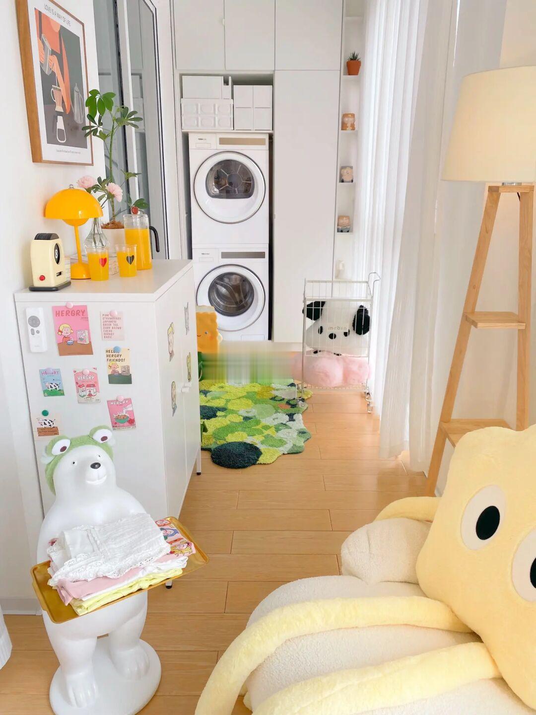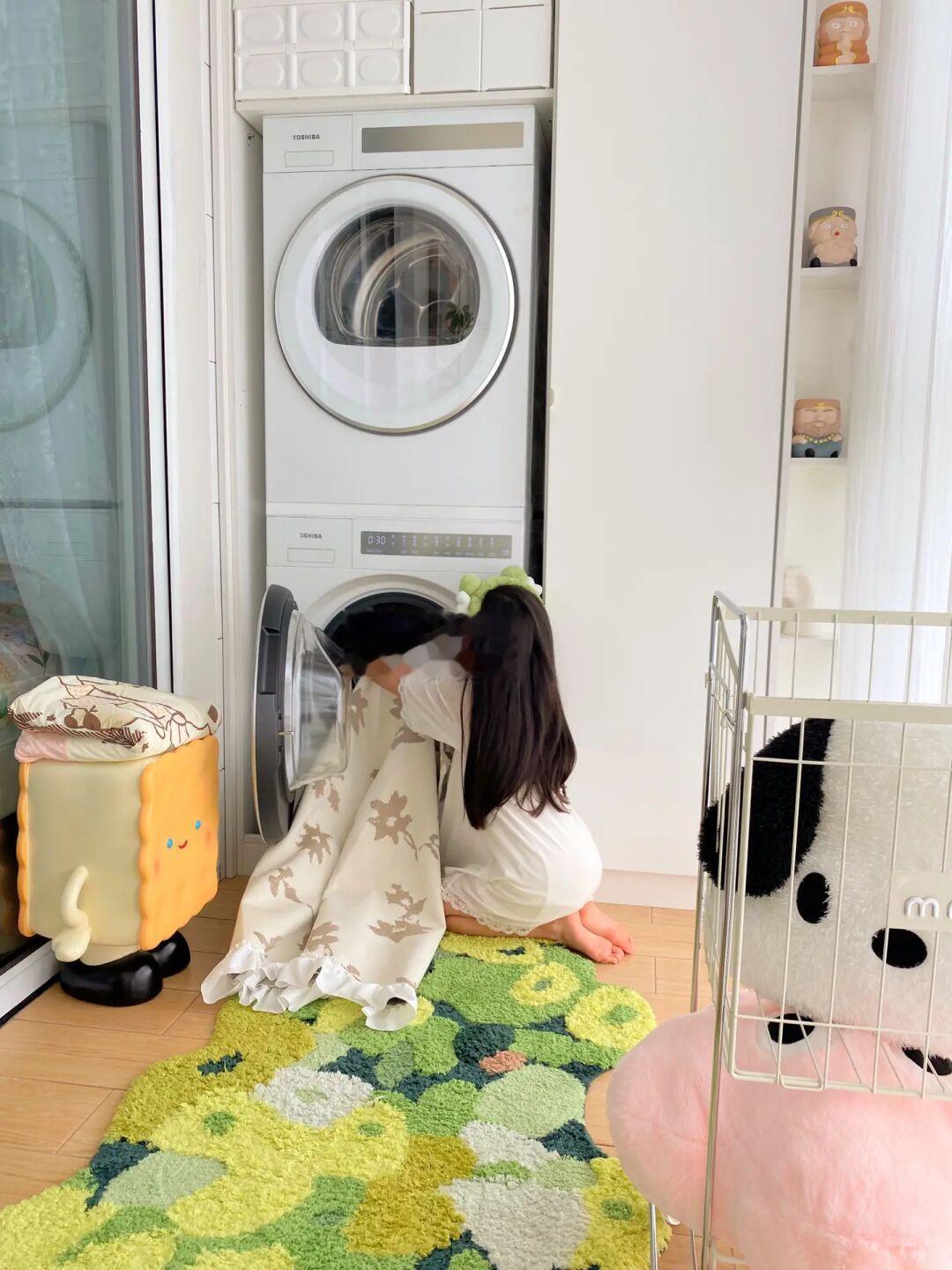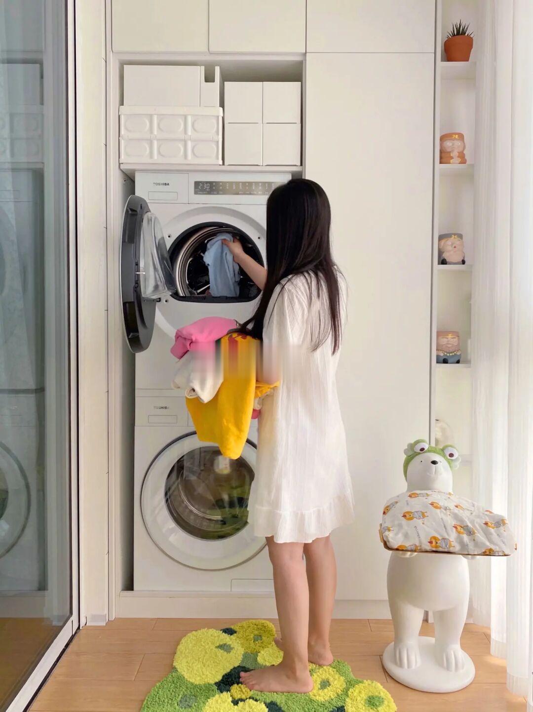 我家柜体与阳台窗户平齐,深度60cm,比较浅,又是先做的柜子后选的洗衣机,尺寸合适又好用的洗衣机真不好找。偶然发现的东芝白珍珠洗烘套装,首先白色外机长在我的审美上,又发现它的尺寸真的太合适了。