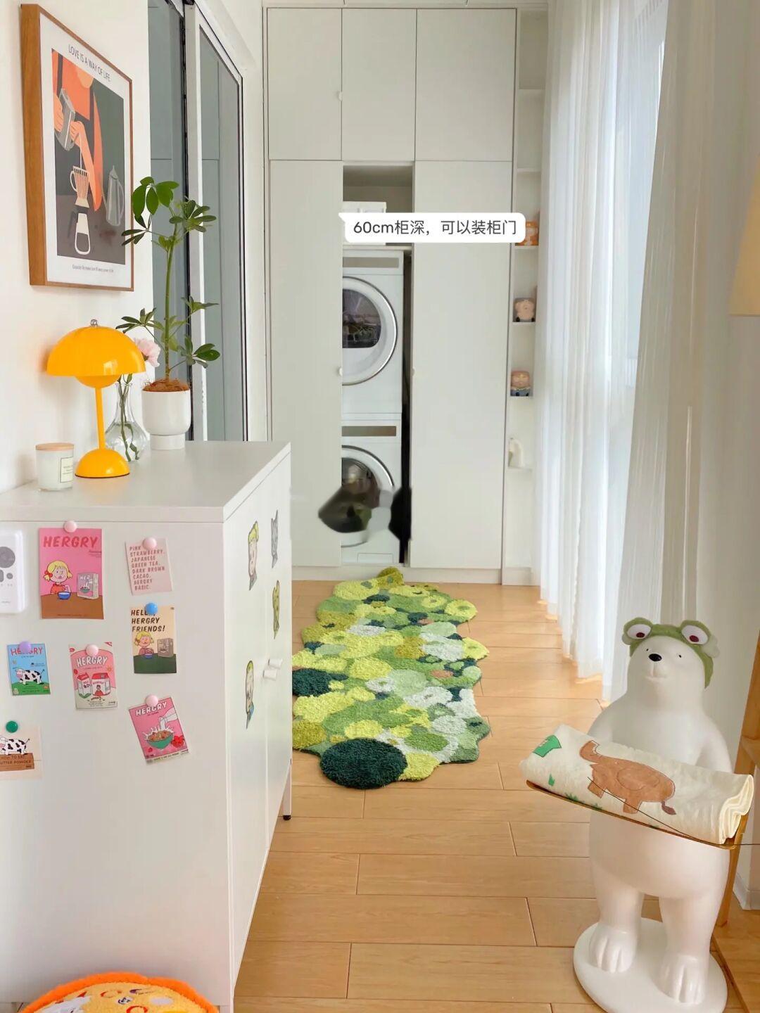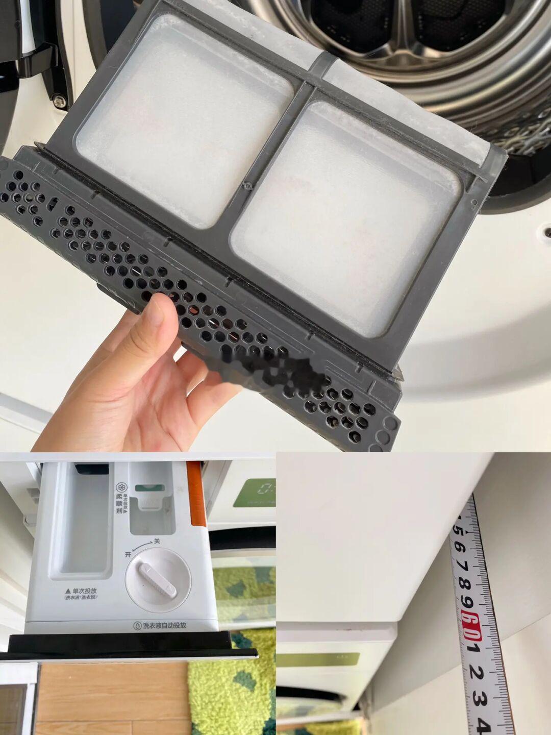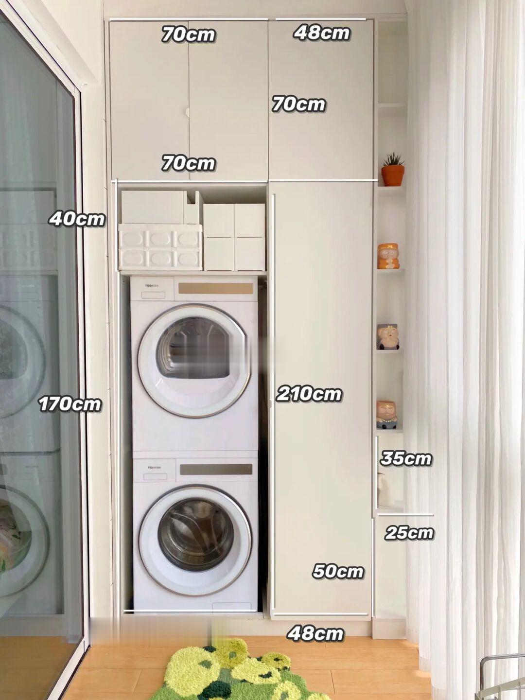 机身可完全嵌入柜子,与柜平齐,机盖薄而精致不太突出,柜深只要60cm就足够了,甚至我还能给洗衣柜装个门。