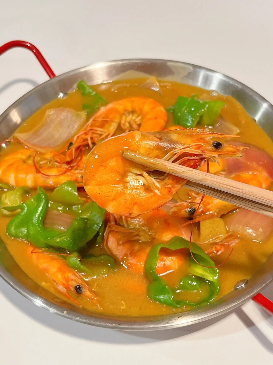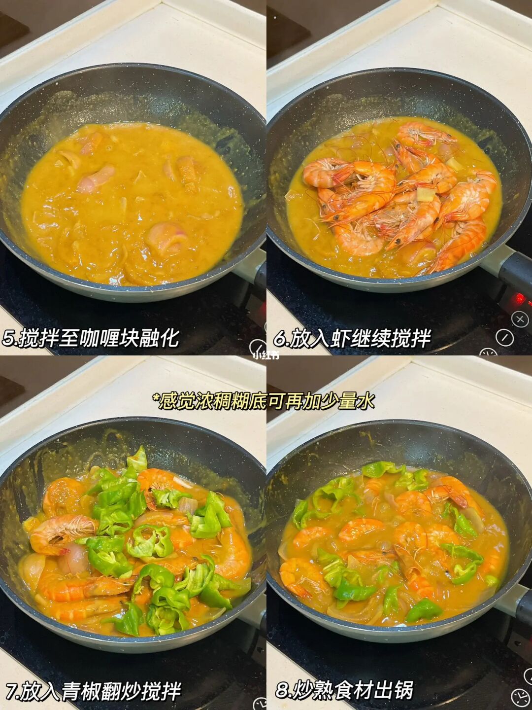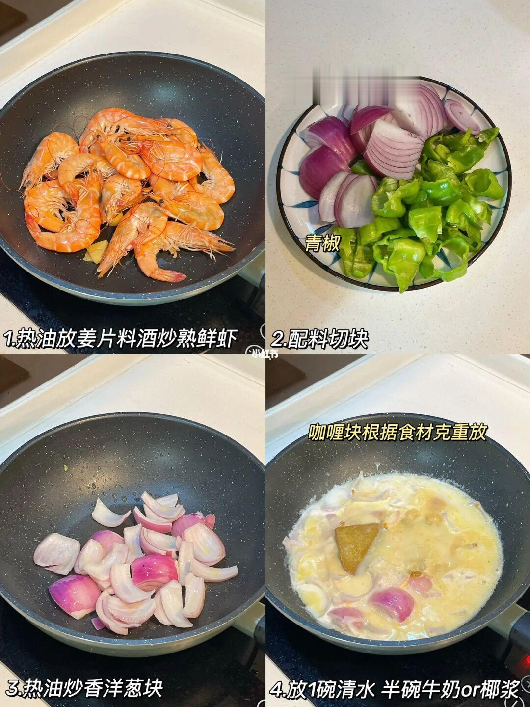 咖喱不管做什么食材都巨巨下饭🍛 今天就来做一个咖喱虾,做法也hin简单,拌饭一绝[偷笑R] - 🦐咖喱虾 食材准备:鲜虾 洋葱 青椒 咖喱块 纯牛奶or椰浆 [一R]先放姜片料酒炒熟鲜虾,捞出备用 [二R]重新起锅热油炒香洋葱块,倒入一碗水和半碗纯牛奶(椰浆更.佳)根据食材克重放咖喱块 [三R]中小火搅拌熬煮至咖喱块融化,放入鲜虾继续搅拌 [四R]再放入青椒块🫑搅拌至食材煮软出锅即可