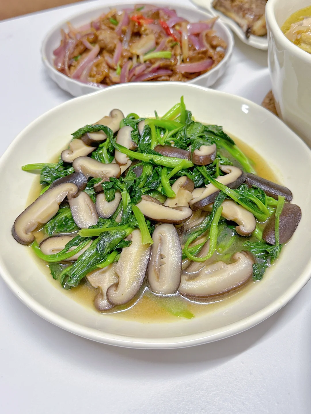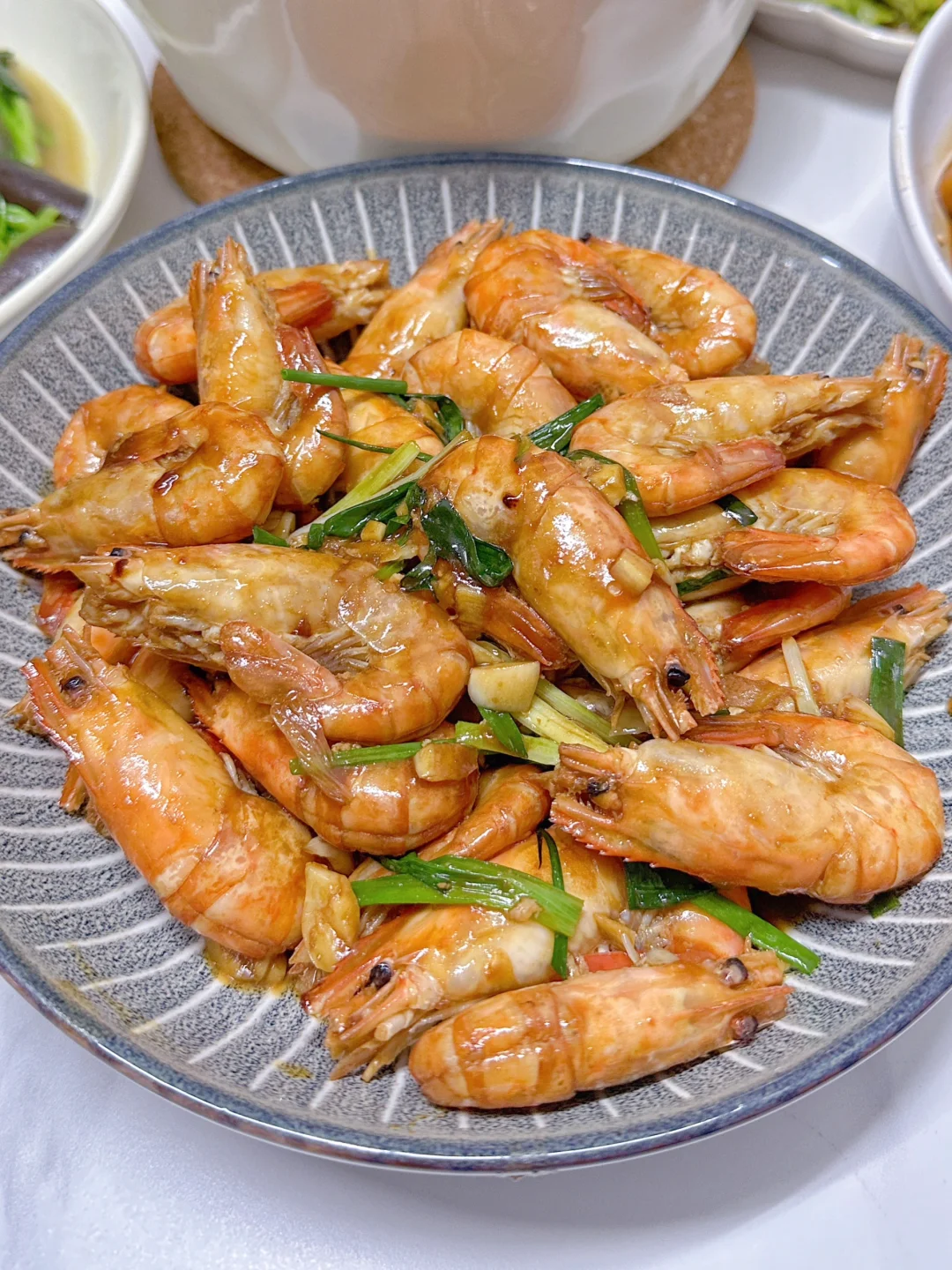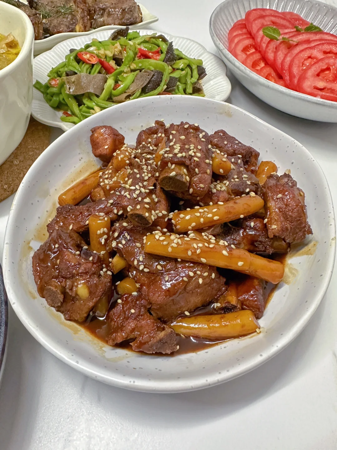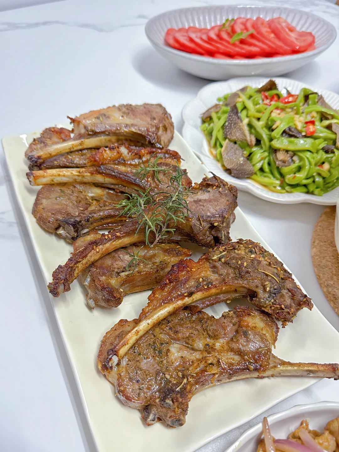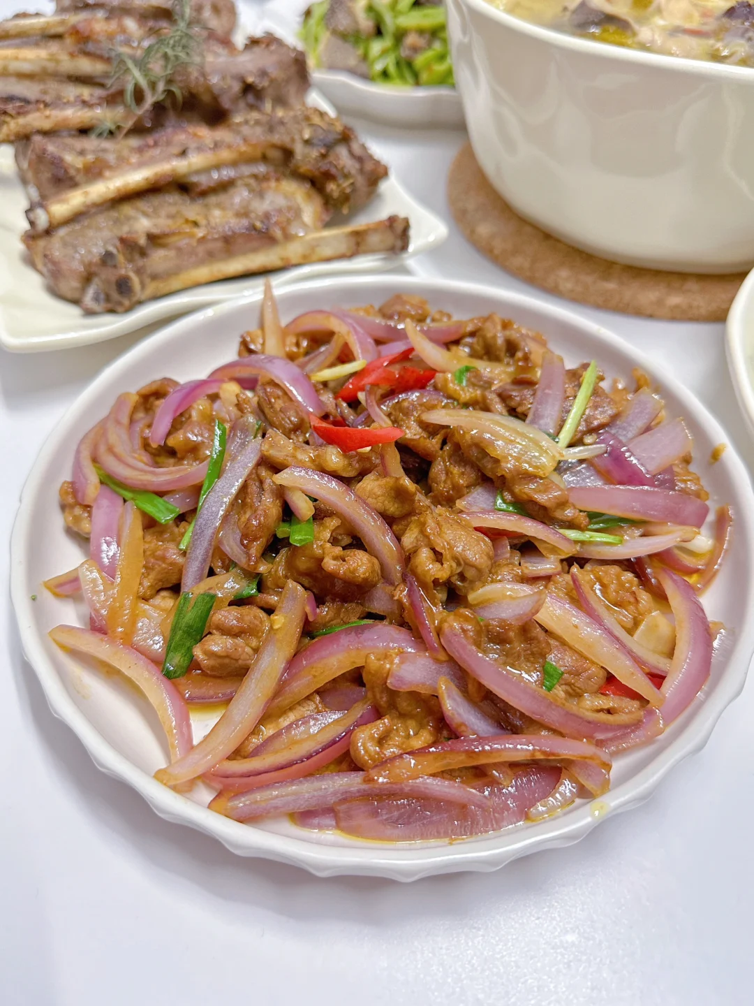 排骨年糕 洋葱炒牛肉 烤羊排 老母鸡汤 芥末罗氏虾 凉拌番茄 凉拌贡菜毛肚 青菜香菇🌈