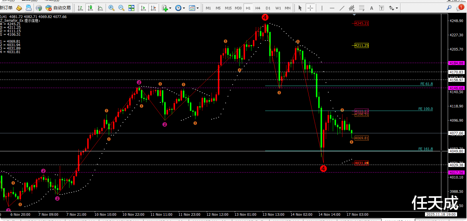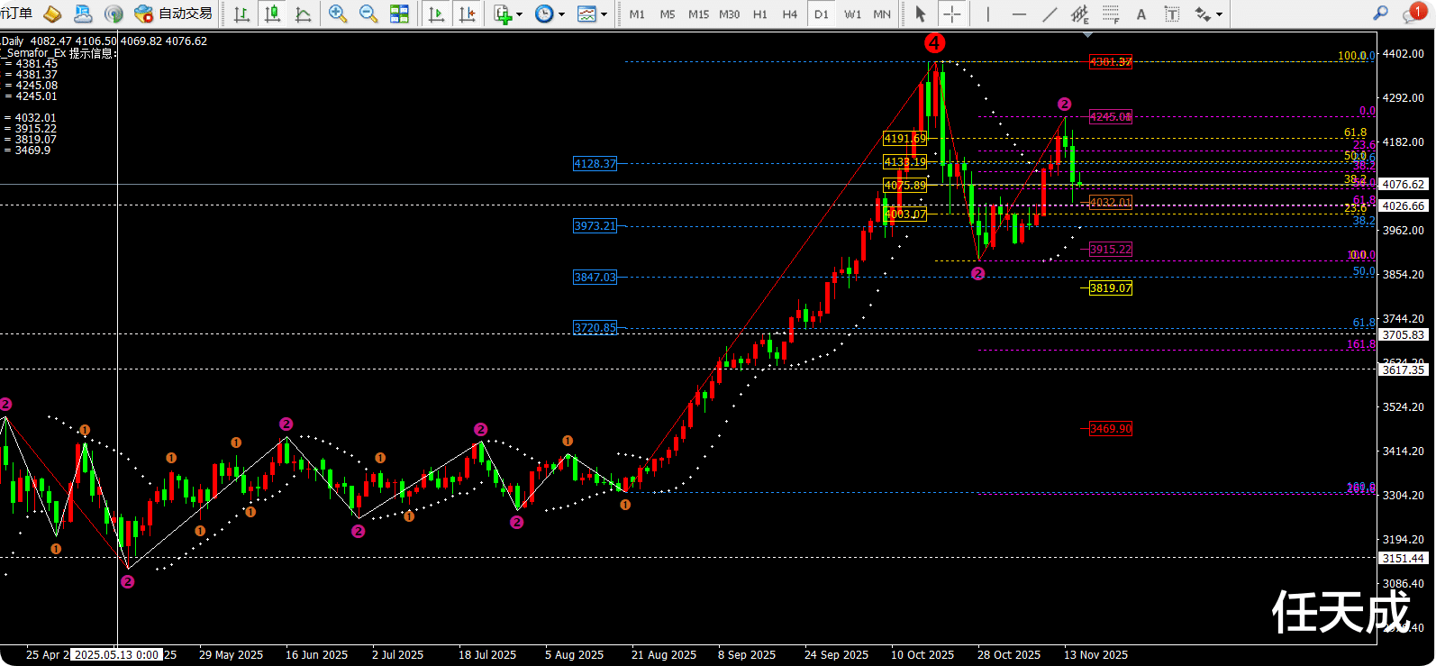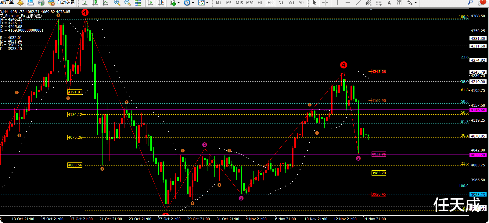 小时线目前震荡下跌,先关注4075-70的低点破位情况,然后是4038一线的支撑。