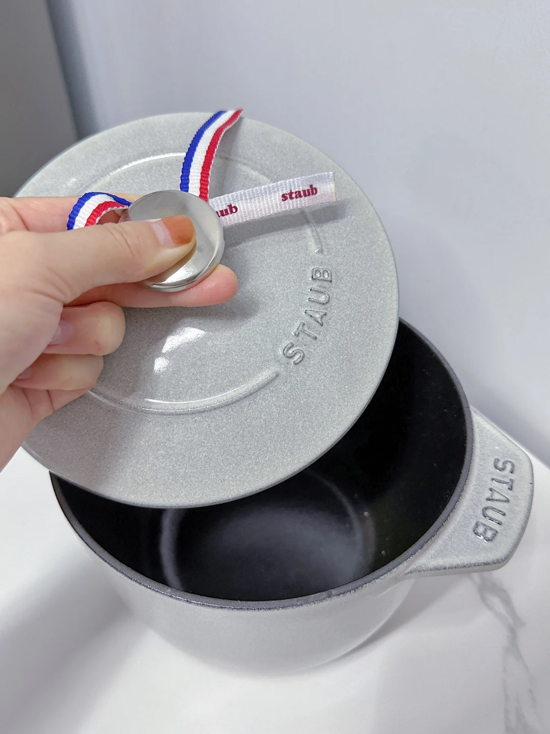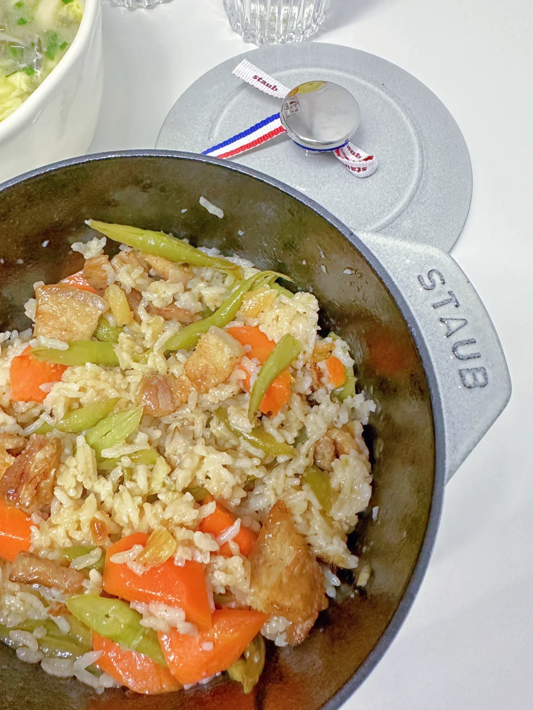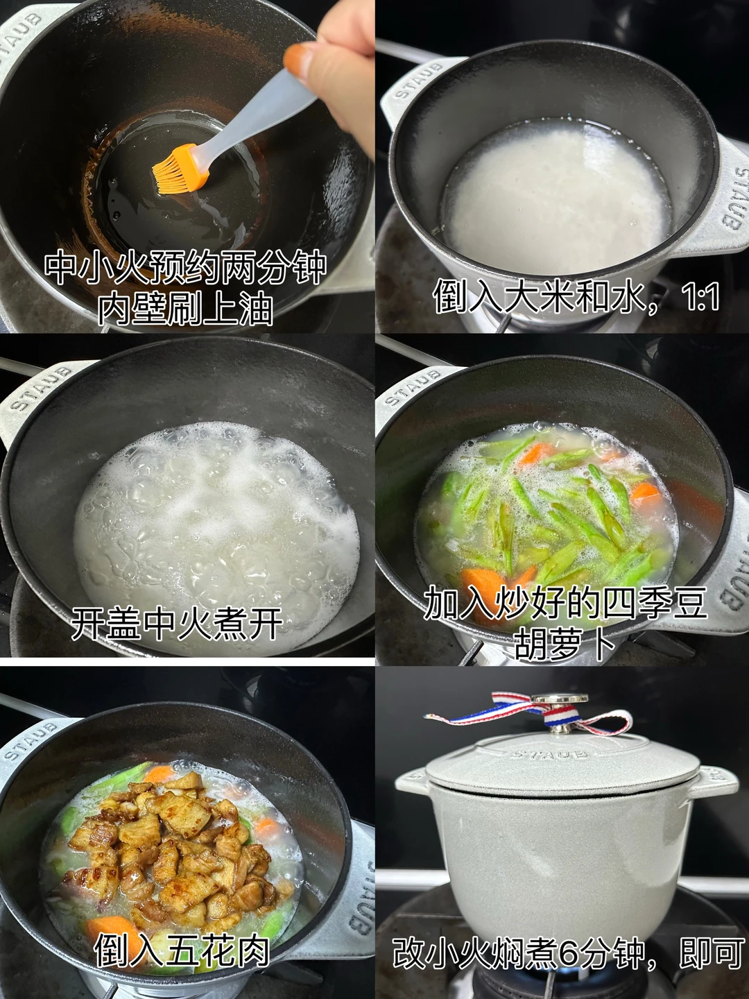 3️⃣大米淘洗干净,泡20分钟,备用。先将staub饭釜用小火预烹饪2-3分钟,然后在锅的内壁上刷上油,倒入大米和水(比例1:1),开盖中火煮开,开盖就可以看到小水珠滴滴答答在落,米饭颗粒贼饱满,它锅盖上的旋风钉点设计,可以让水汽蒸发时凝结到钉点,锁水,保留住食材原本的味道