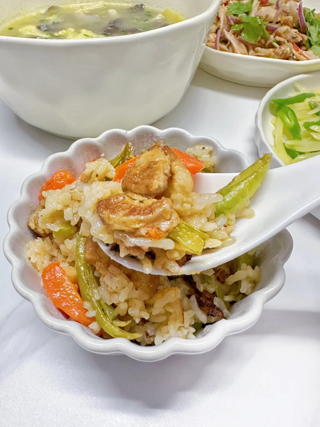 青椒土豆丝 凉拌鸡肉 平菇鸡蛋汤 五花肉焖饭🌈