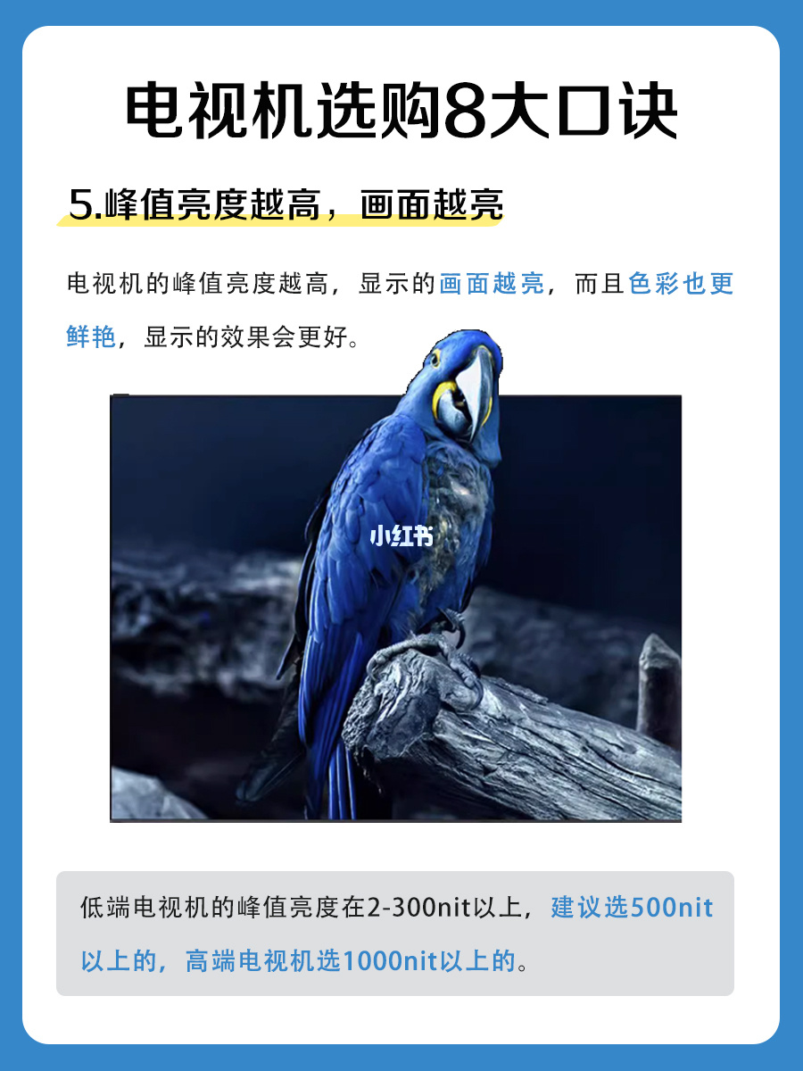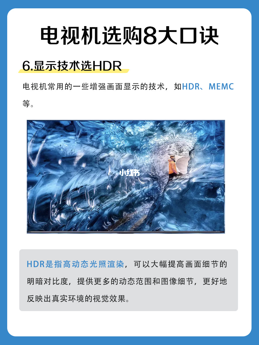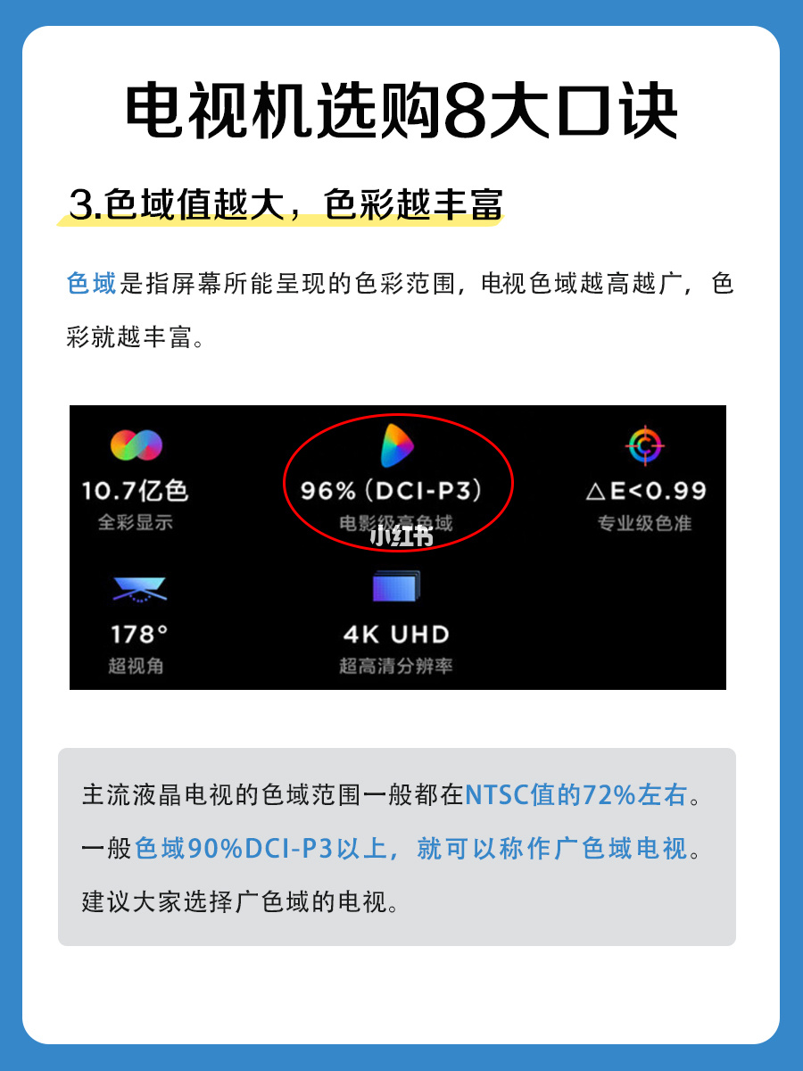 这期分享保姆级电视选购攻略,小白必看哦~ 快来抄下这8个tips: 1️⃣不买小尺寸电视 2️⃣分辨率选4K 3️⃣色域值越大,颜色越丰富 4️⃣刷新率越高,画面越流畅 5️⃣峰值亮度越高,亮度越高 6️⃣显示技术选HDR 7️⃣不买音质差的 8️⃣不买配置低的