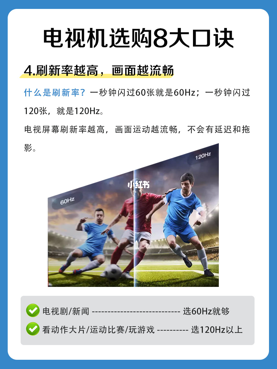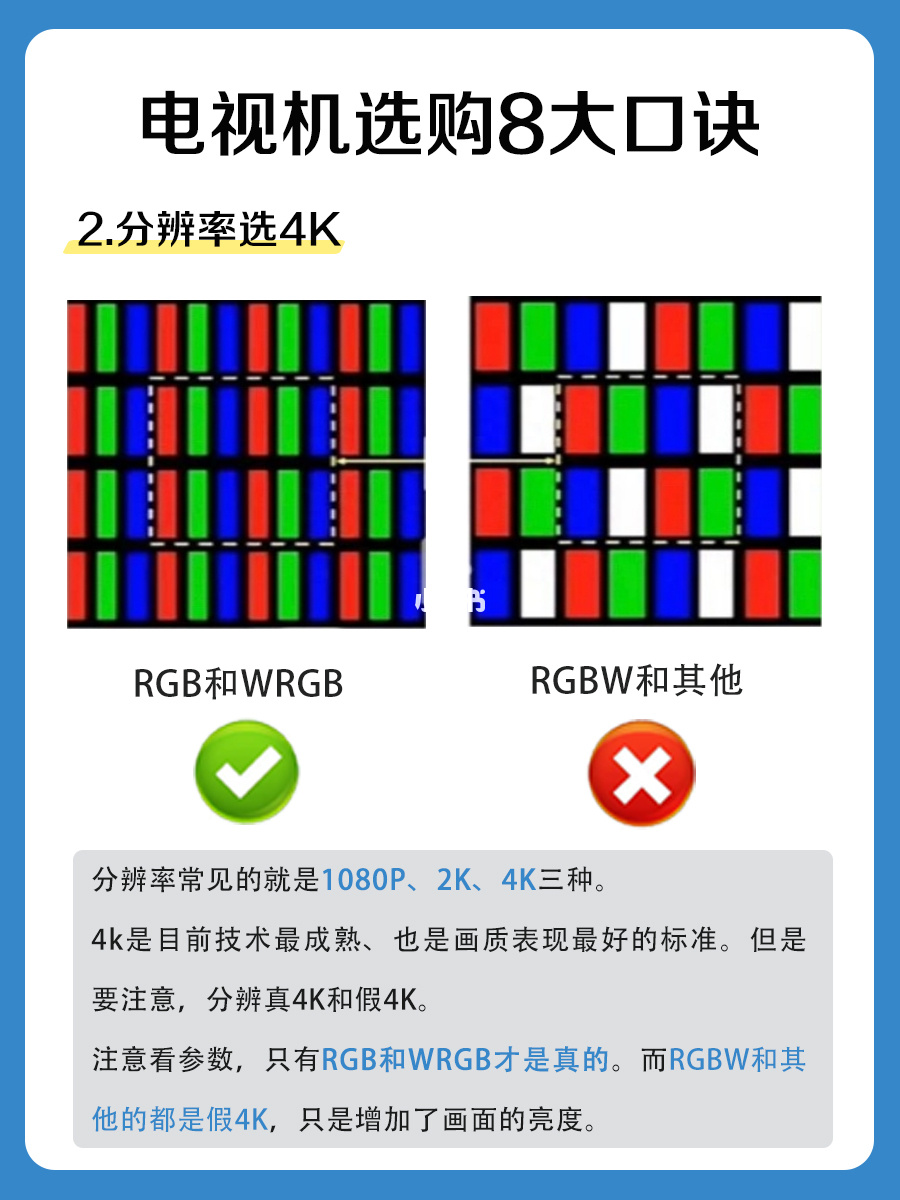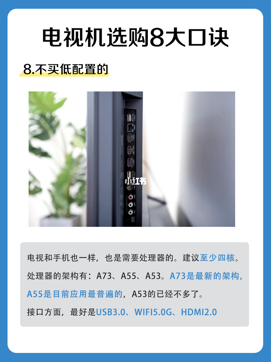 这期分享保姆级电视选购攻略,小白必看哦~ 快来抄下这8个tips: 1️⃣不买小尺寸电视 2️⃣分辨率选4K 3️⃣色域值越大,颜色越丰富 4️⃣刷新率越高,画面越流畅 5️⃣峰值亮度越高,亮度越高 6️⃣显示技术选HDR 7️⃣不买音质差的 8️⃣不买配置低的