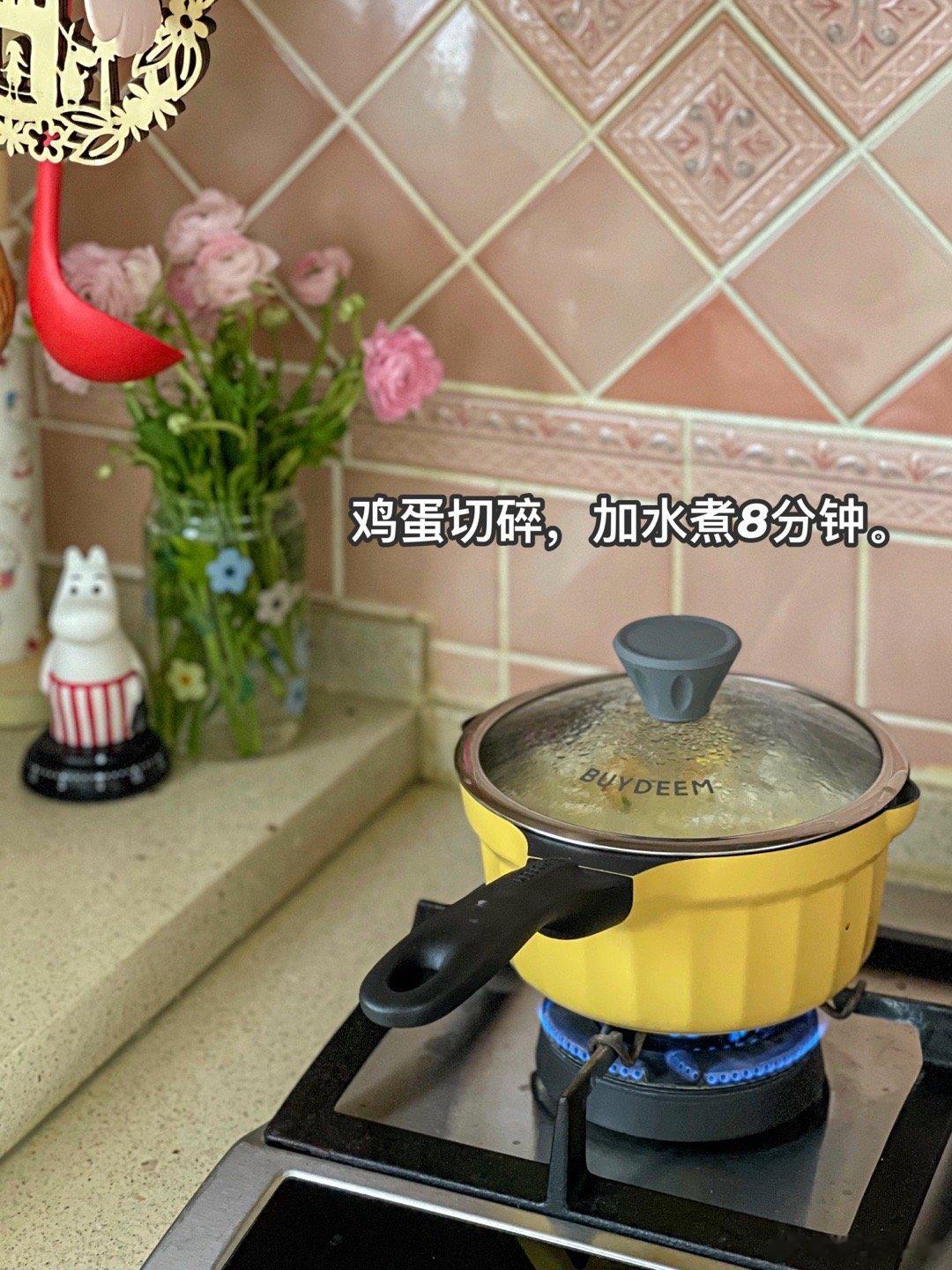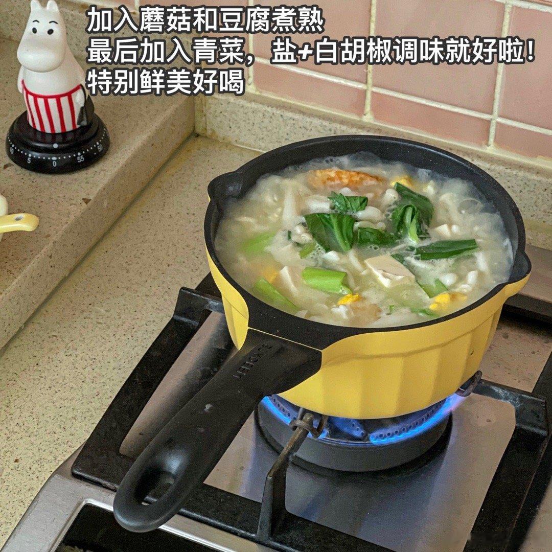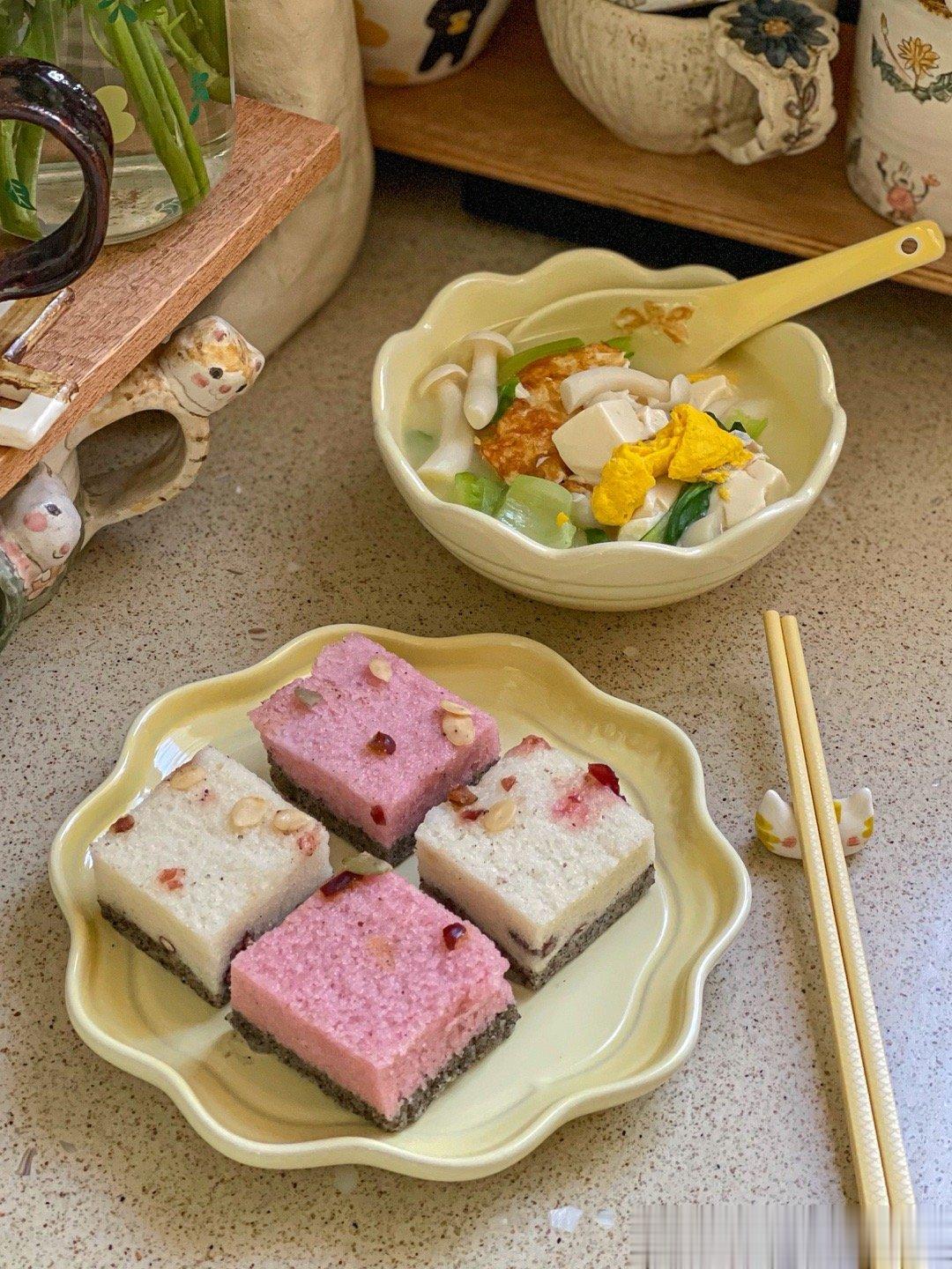 午饭和早餐太近,简单吃一点。鸡蛋蘑菇汤+黑芝麻松糕,鲜美。