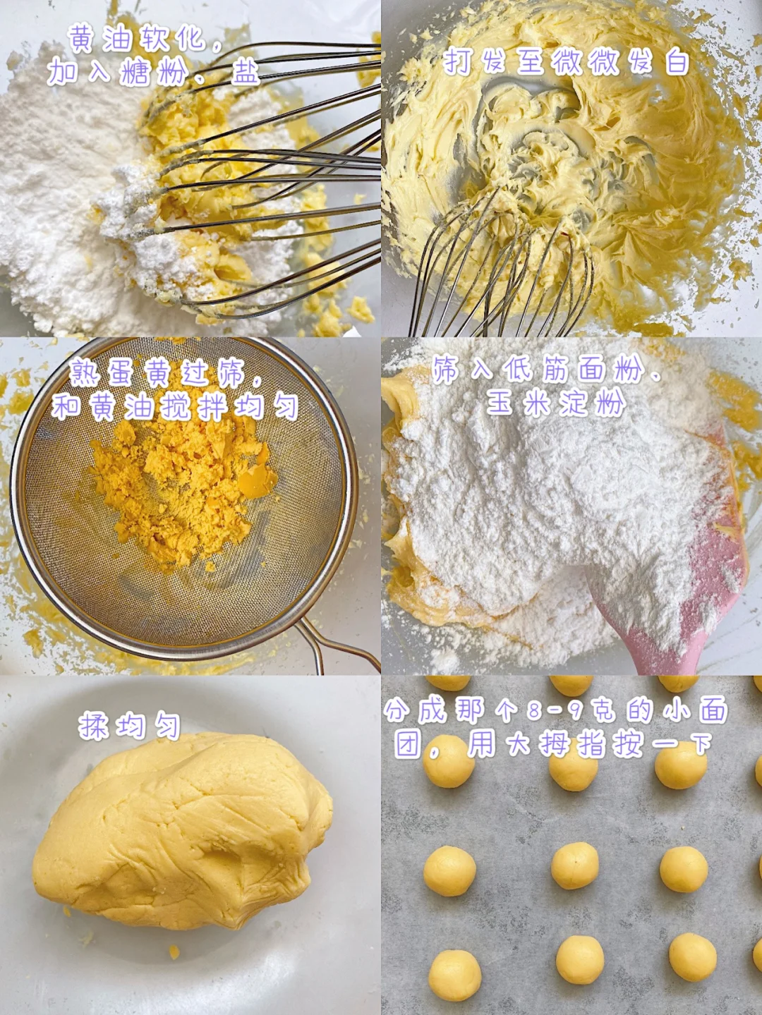 2⃣️黄油提前室温软化好,加入糖粉、盐打发至微微发白,把熟蛋黄筛入黄油中,搅拌均匀