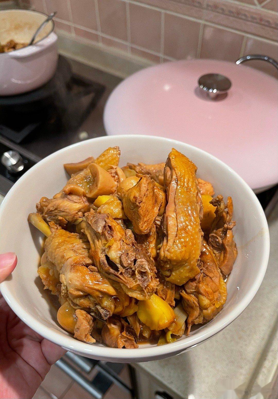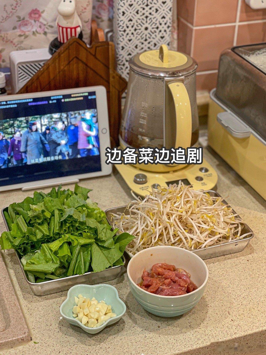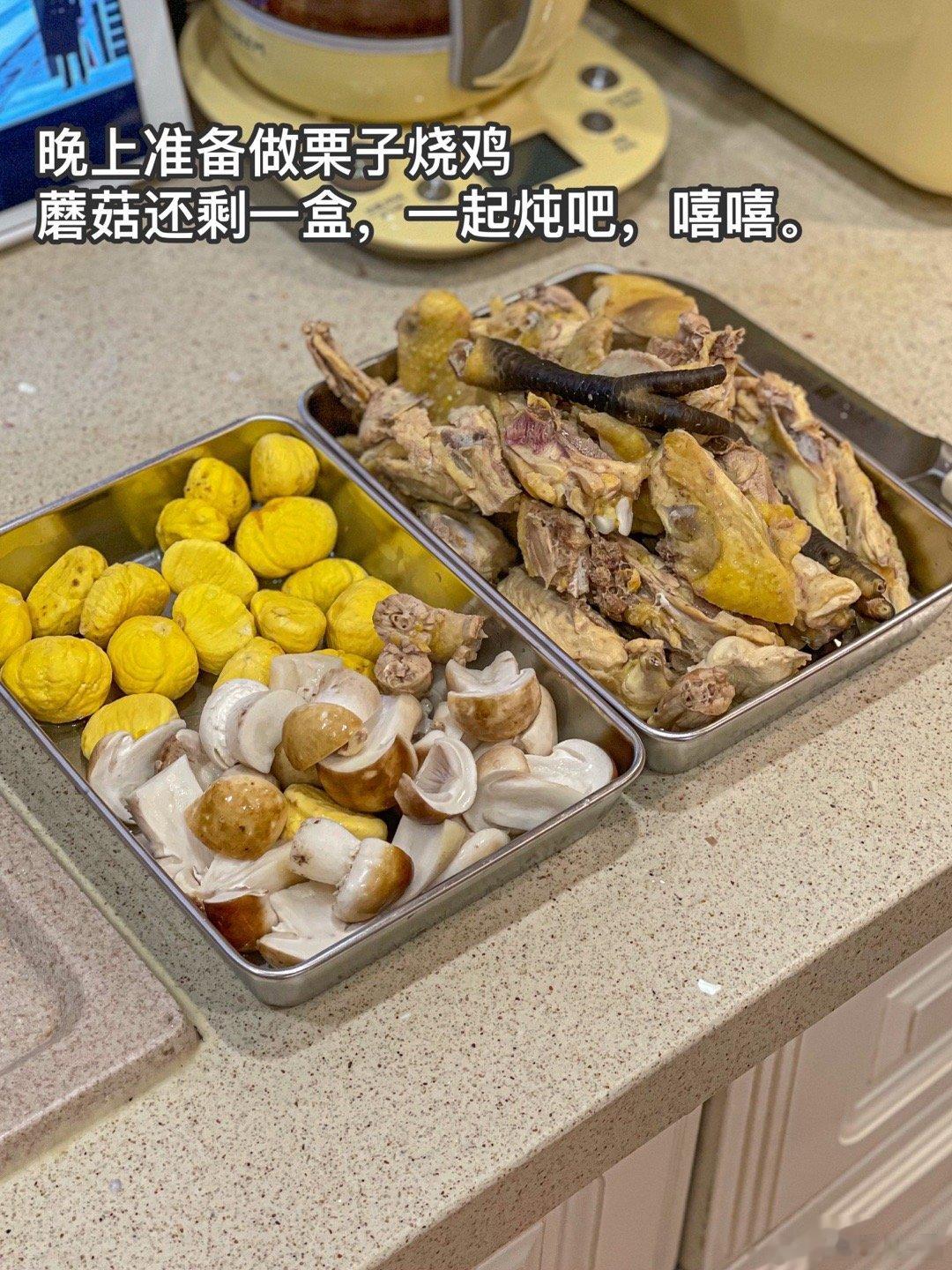 晚餐:栗子烧鸡+炒绿豆芽+炒油麦菜现在炒青菜可以用蒜末啦,铁锅爆炒,加什么青菜都