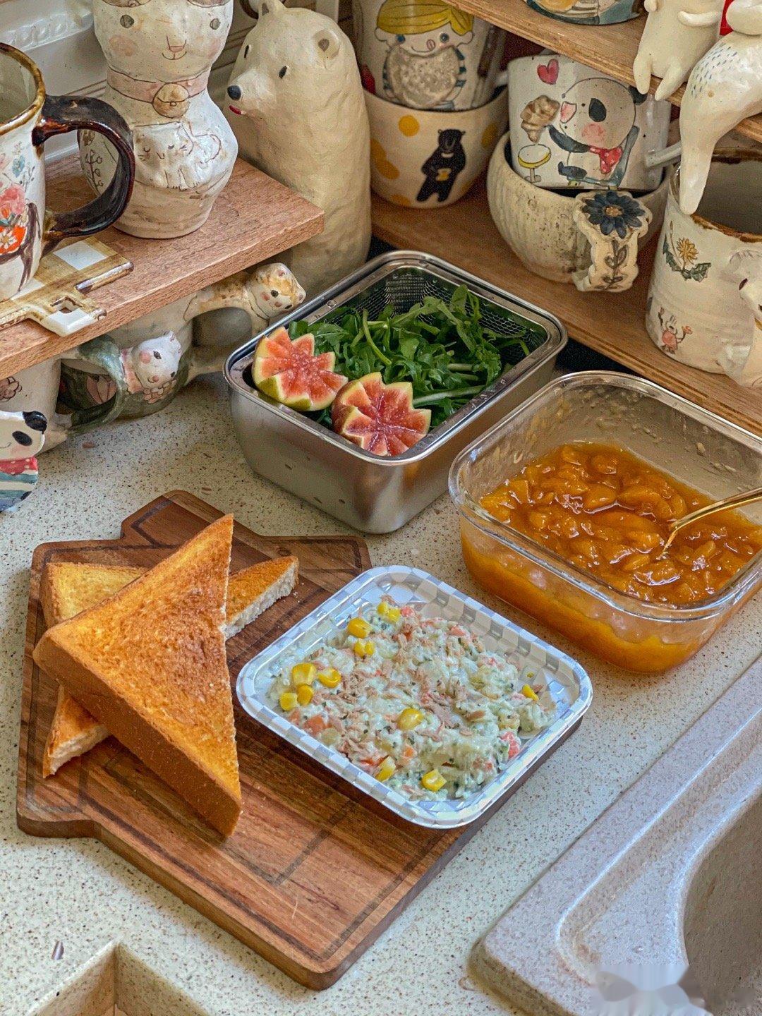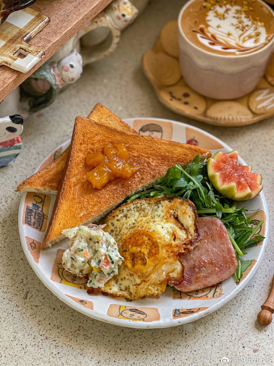 早餐:吐司抹黄桃酱+煎午餐肉+桂花拿铁