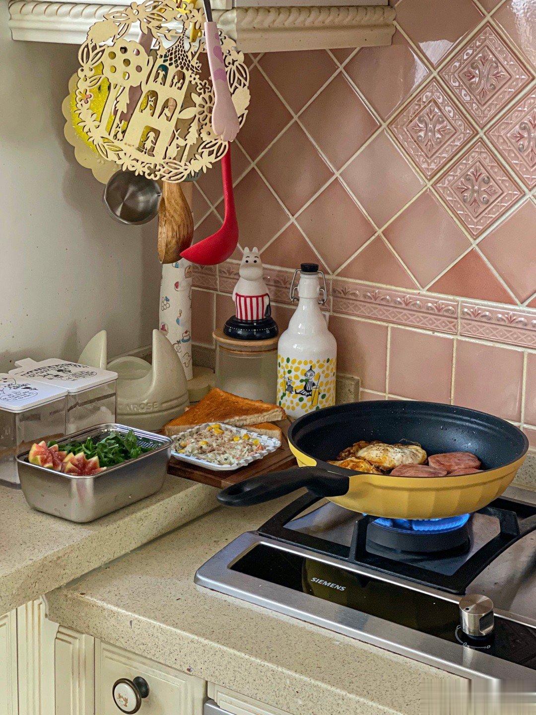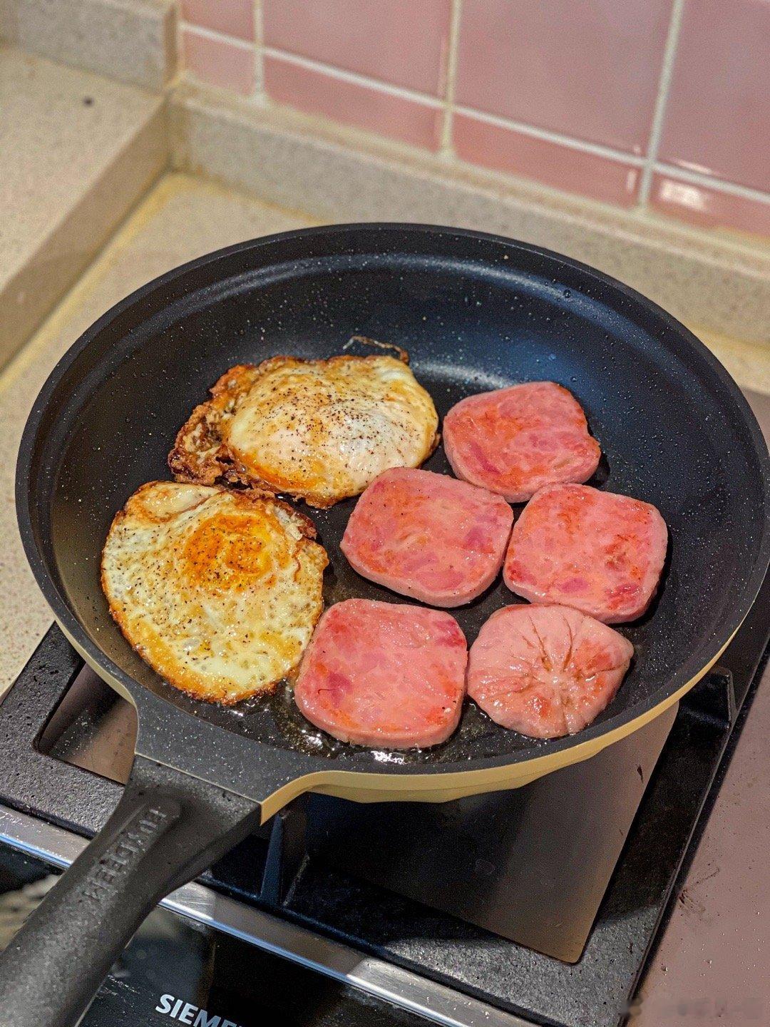 启动空气炸锅烘烤热吐司,平底锅煎鸡蛋和午餐肉,暖乎乎。