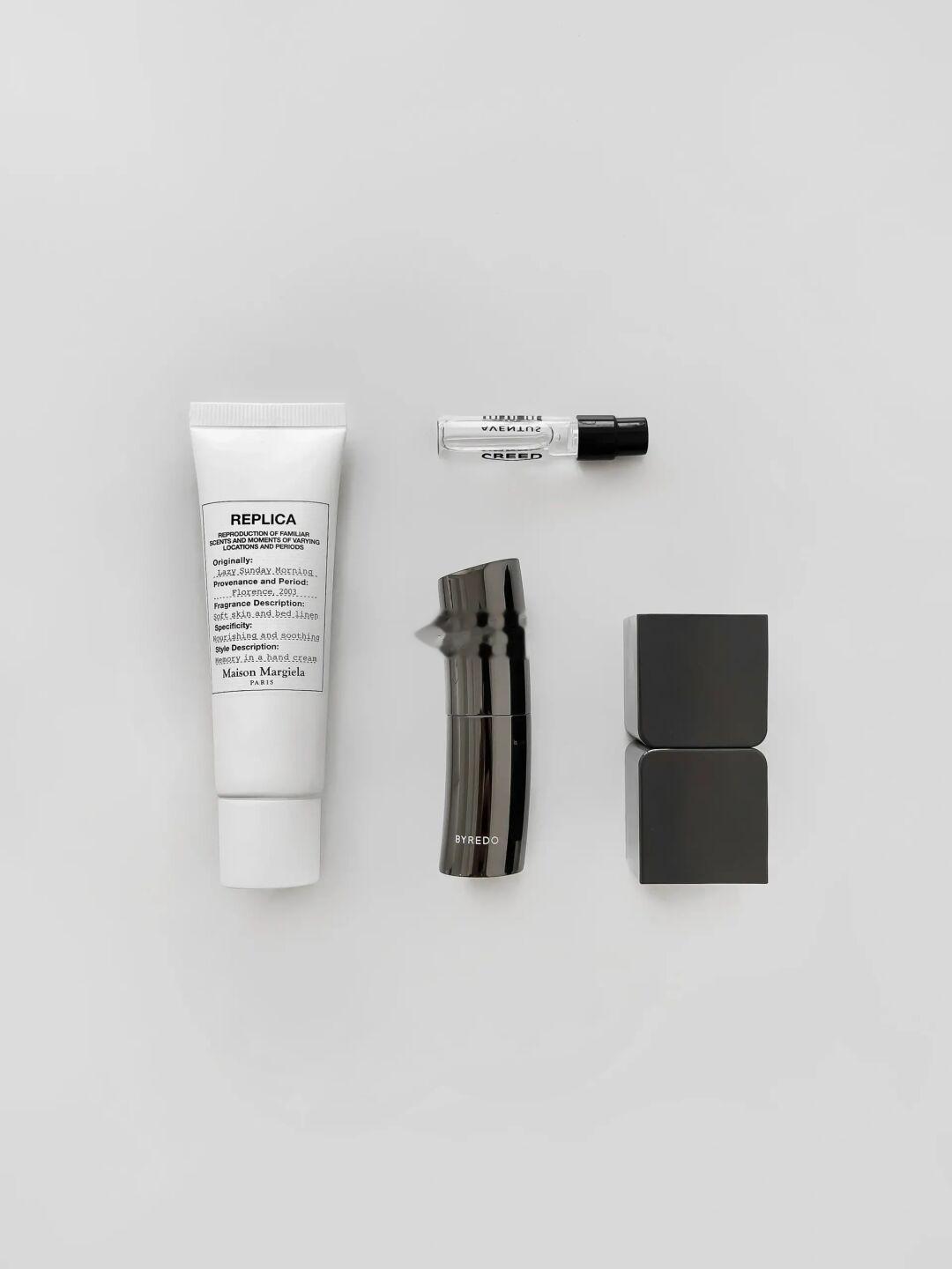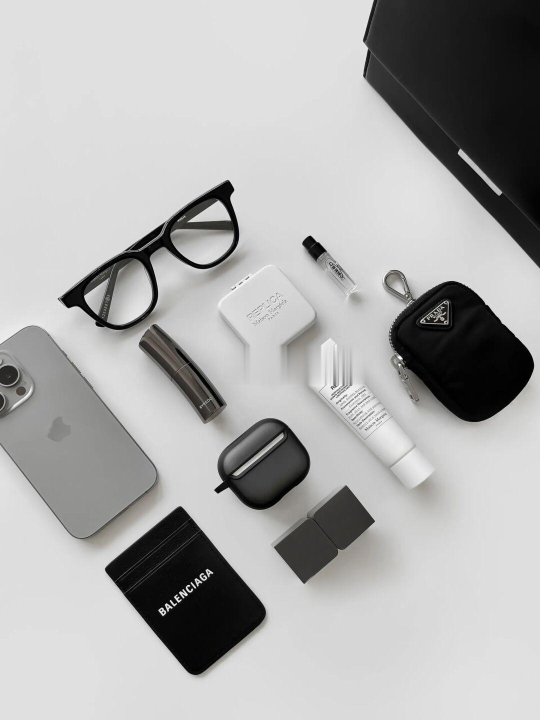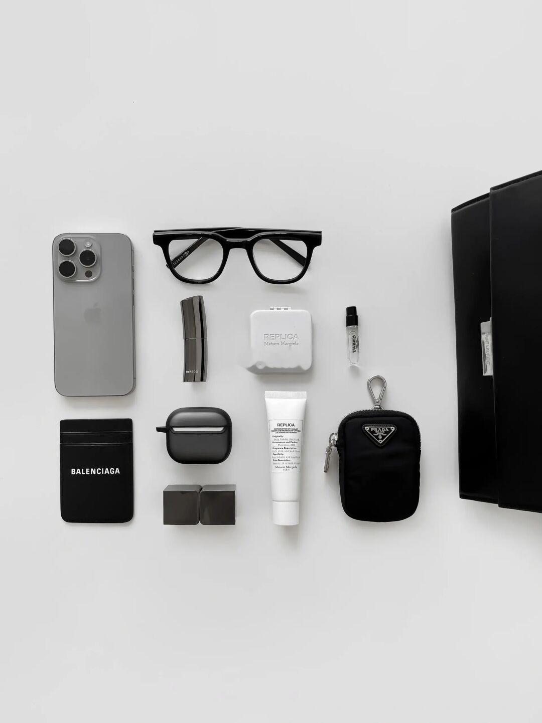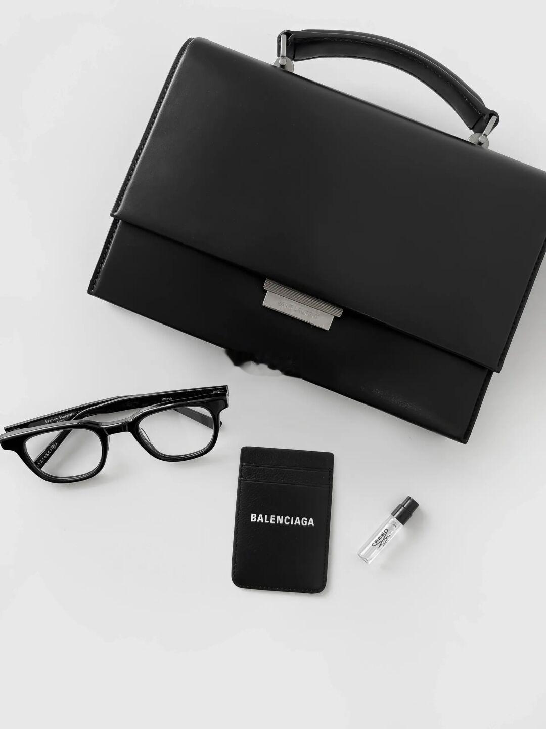 日常通勤翻个包 分享些可能会用到时髦又实用的小玩意 - ▪️包包:SAINT LAURENT ▪️零钱包:PRADA ▪️眼镜:Maison Margiela x Gentle Monster ▪️镜子、护手霜:Maison Margiela ▪️润唇膏:Byredo ▪️香膏:Tamburins ▪️香水:Creed -