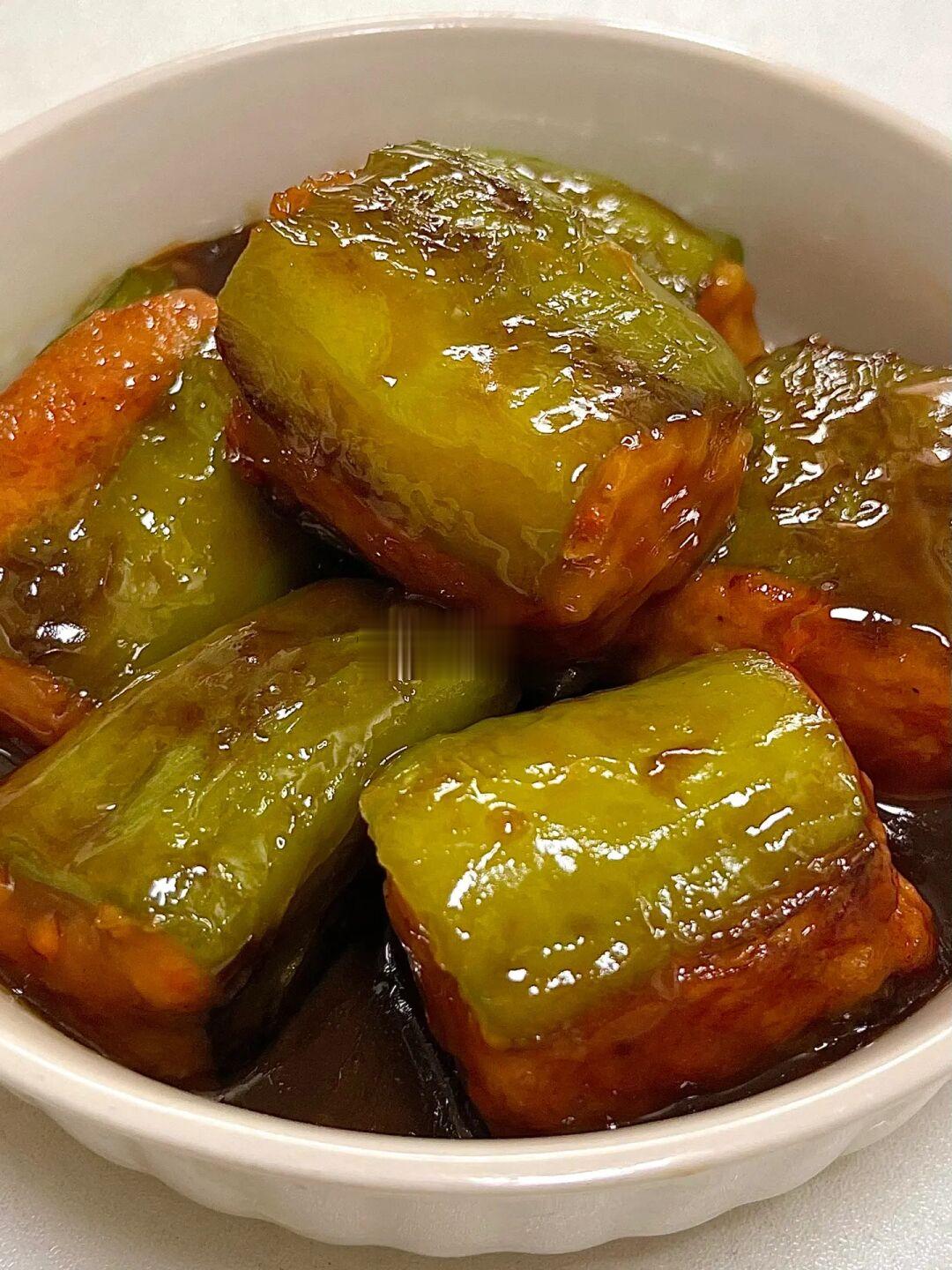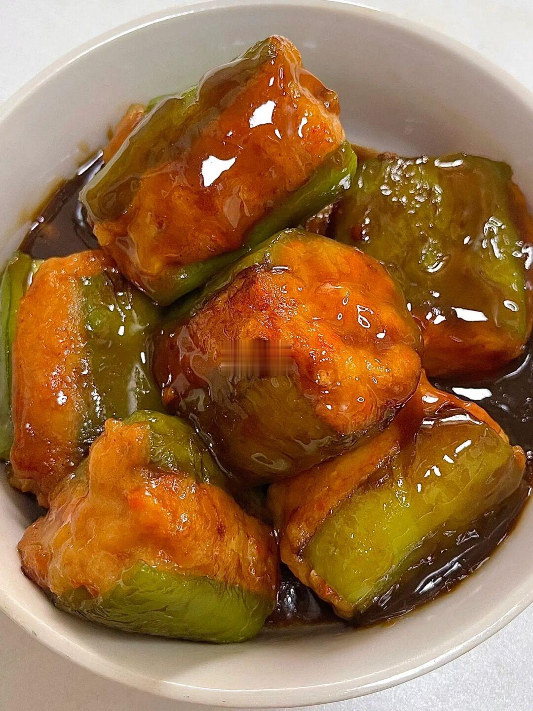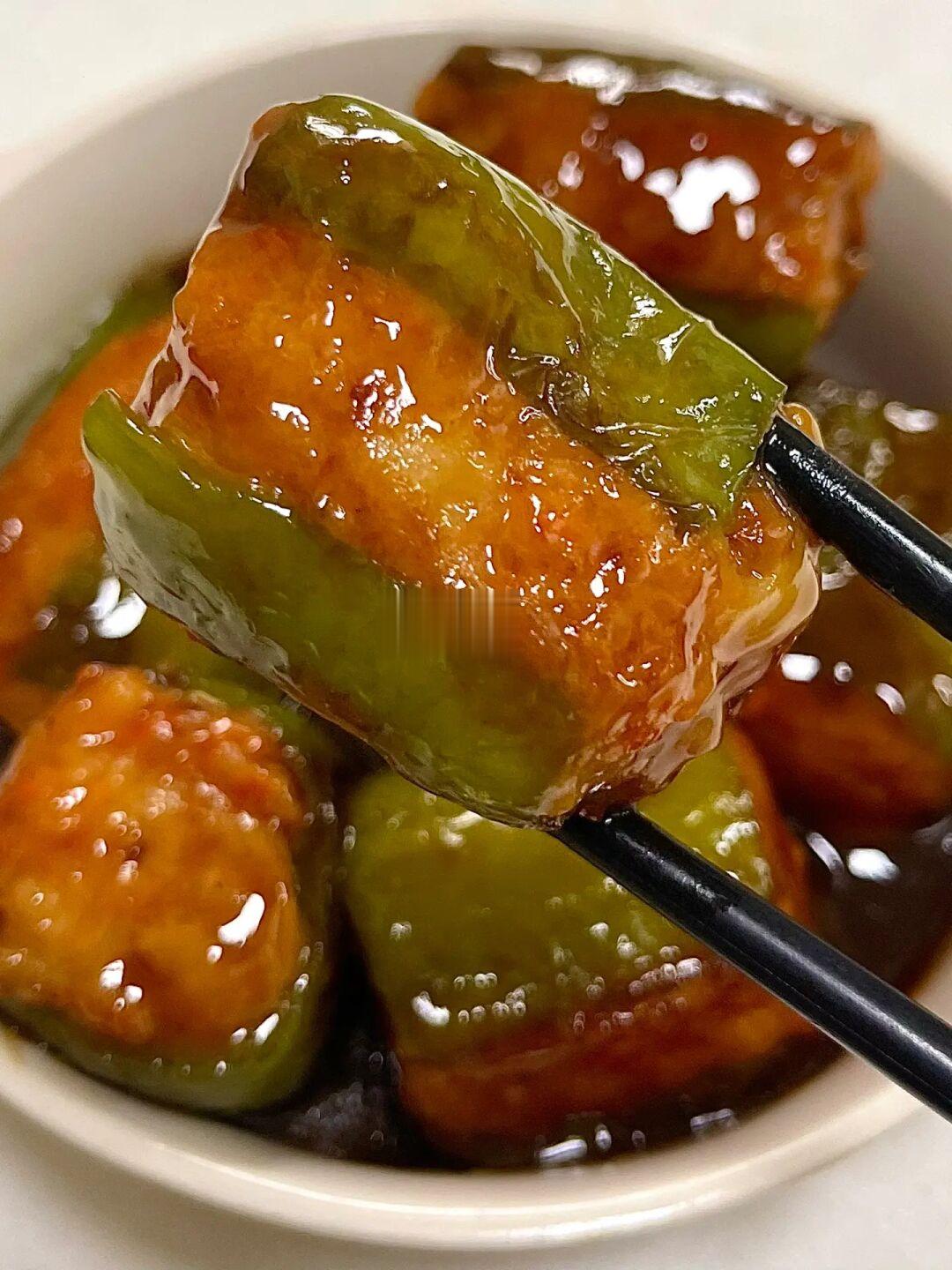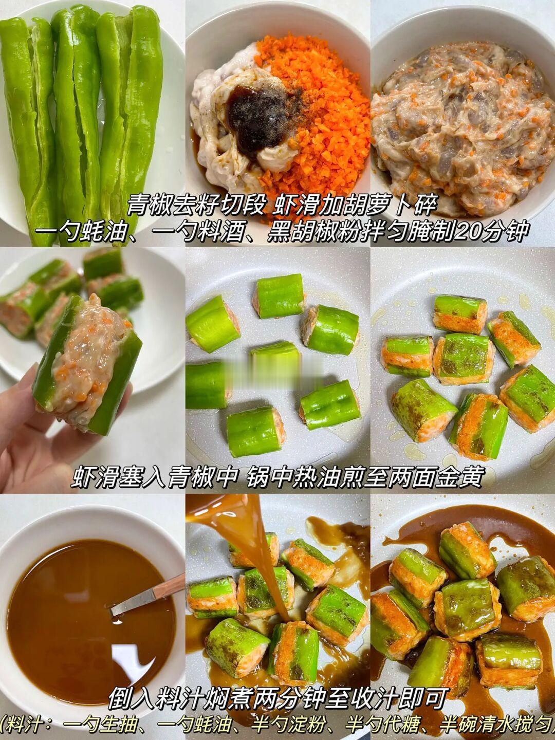 救命这个真的贼好吃!青椒酿虾滑! 煎的焦香的青椒~Q弹紧嫩的虾滑 搭配上浓郁可口的料汁 一口一个满足! 减脂期也可以放心吃~姐妹们赶紧去试试! - 食材:青椒 虾滑 胡萝卜 调一碗料汁:1勺生抽、1勺蚝油、1勺料酒、半勺代糖、半勺玉米淀粉、半碗清水搅匀 ☑️碗里准备虾滑、胡萝卜碎,放入1勺蚝油、1勺料酒、适量黑胡椒粉拌匀腌制20分钟 ☑️青椒洗净去籽切段,塞入虾滑,下锅煎至两面金黄(虾肉一面先煎 不容易散开) ☑️倒入料汁,焖煮至汤汁浓稠即可