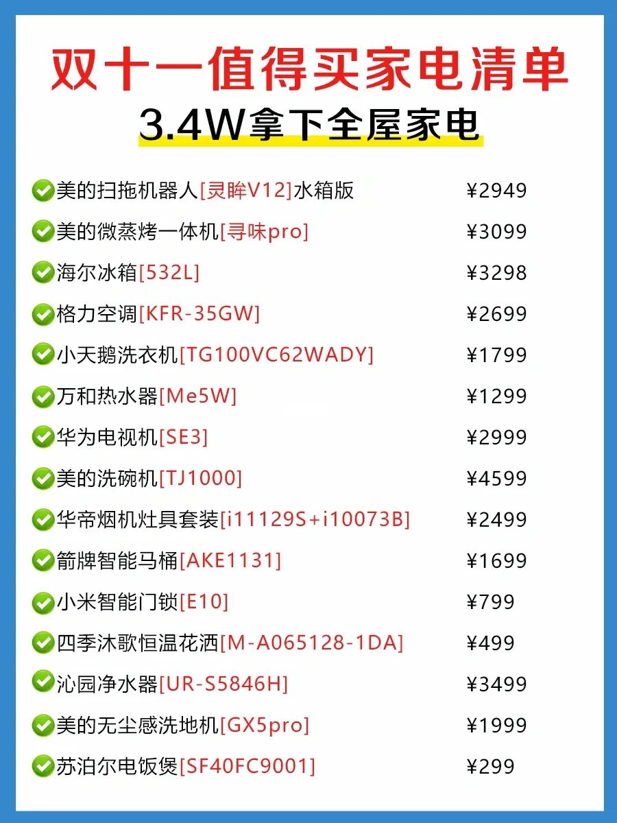 我花了3天时间,📝整理了一份双十一的优惠时间和💰薅羊毛攻略,还有家电的选购技巧和双十一值得买的家电清单,3.4W就能拿下全屋家电,大家快来抄作业吧~