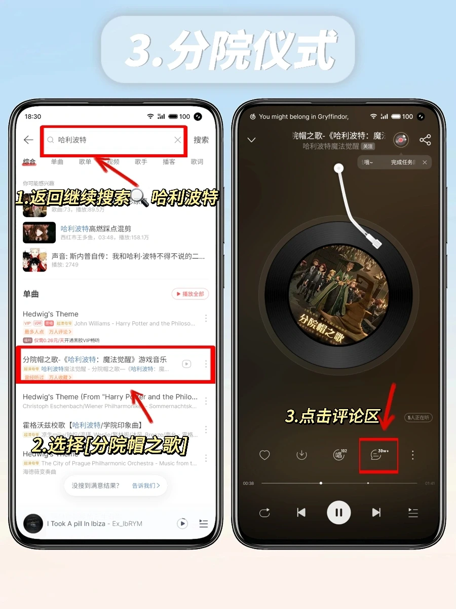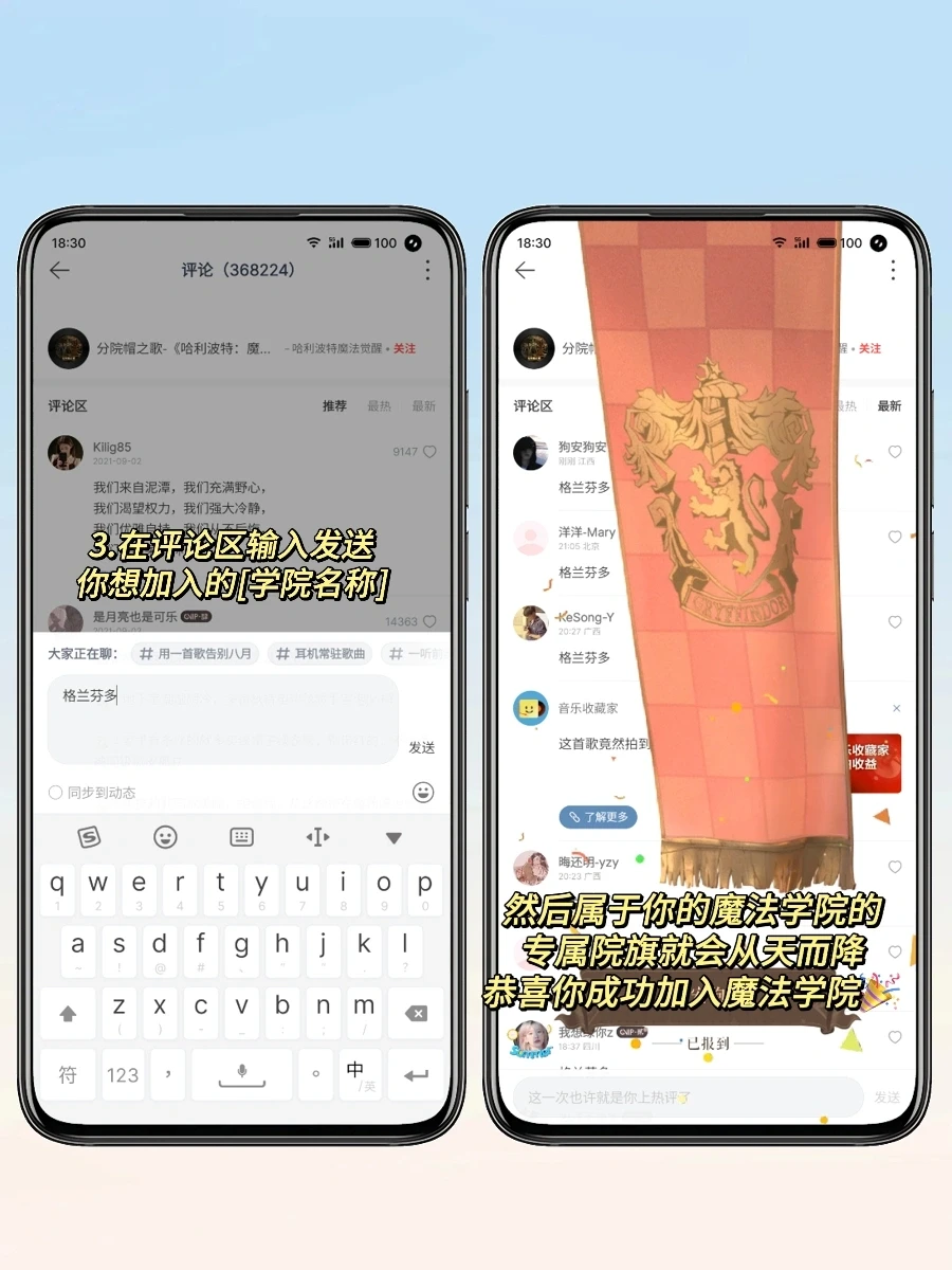 4️⃣返回搜索列表,点击分院帽之歌,在评论区输入你喜欢的学院名称就开始举行分院仪式啦!