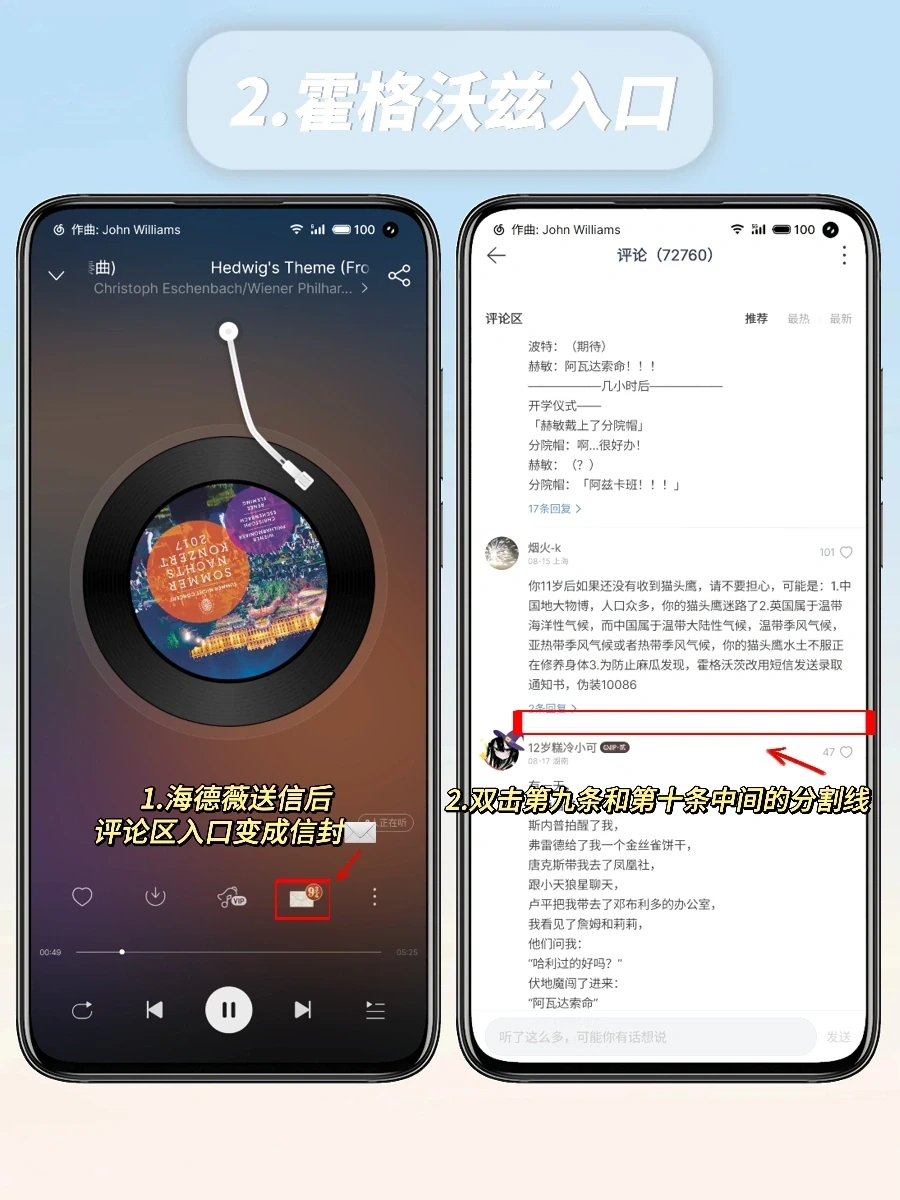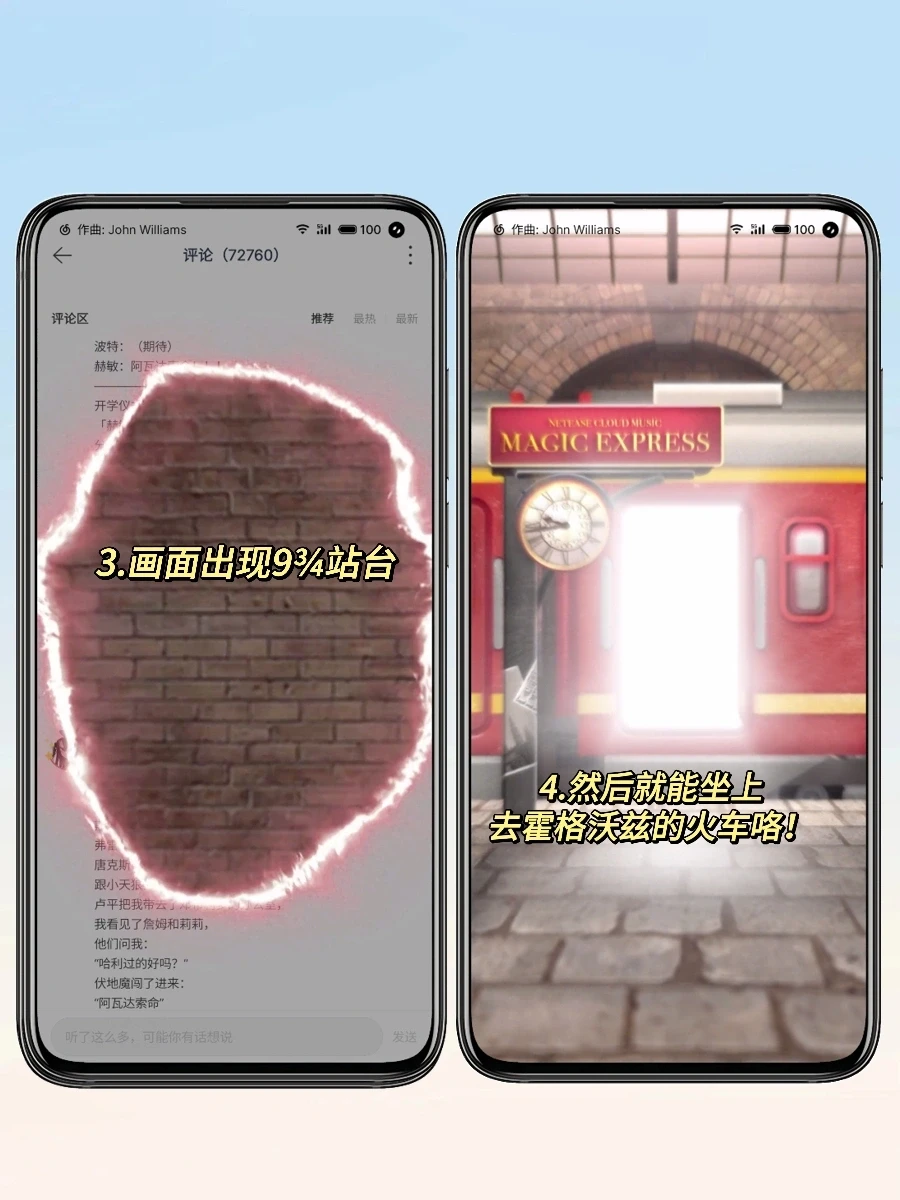 3️⃣点开评论区,找到第九和第十条评论中间的细线,双击就可穿越到九又四分之三站台,会有一趟去往霍格沃兹的火车🚞等你喔