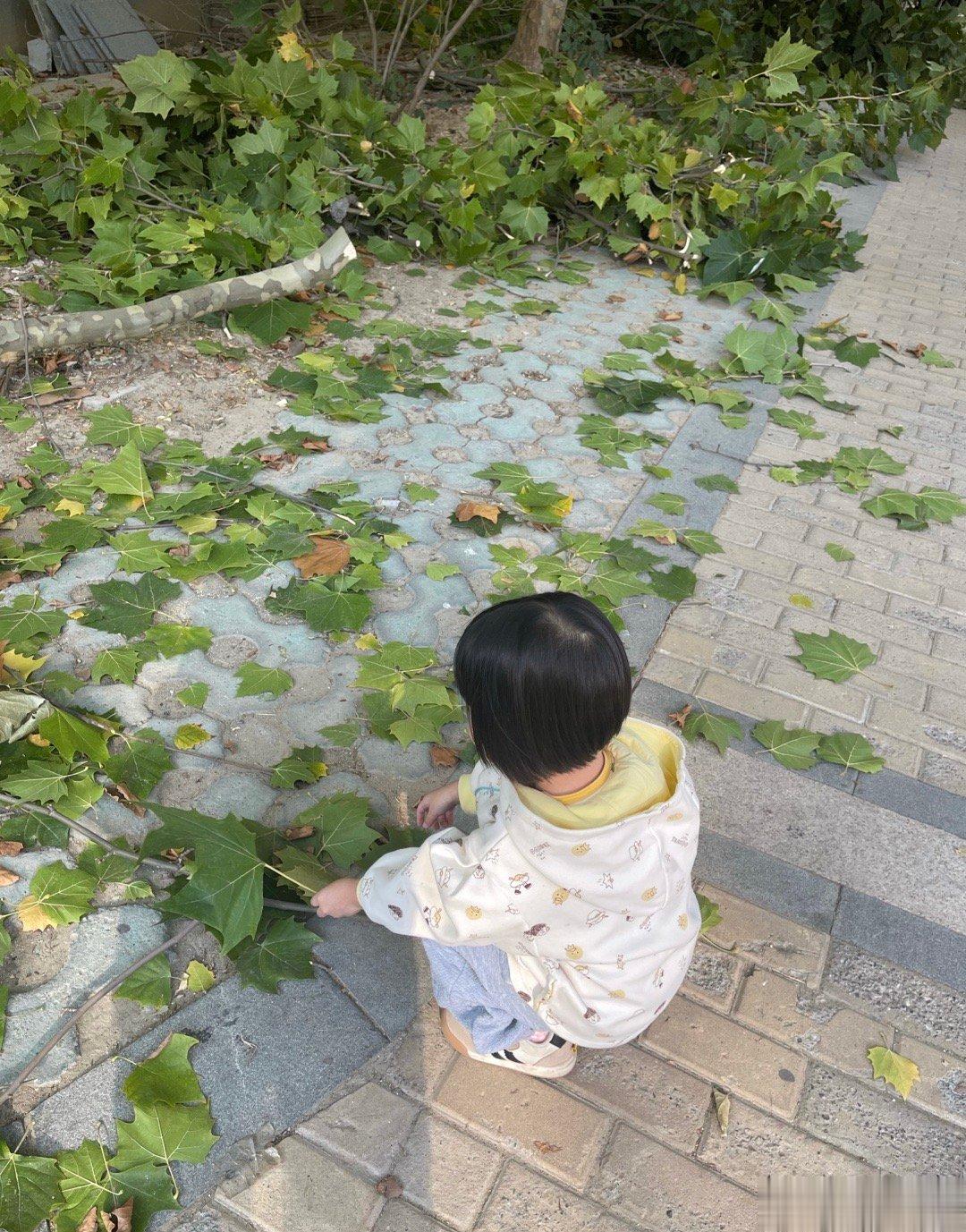 小区里在修剪树枝,我和乔乔捡树叶,拔树根玩,快乐可以很简单。