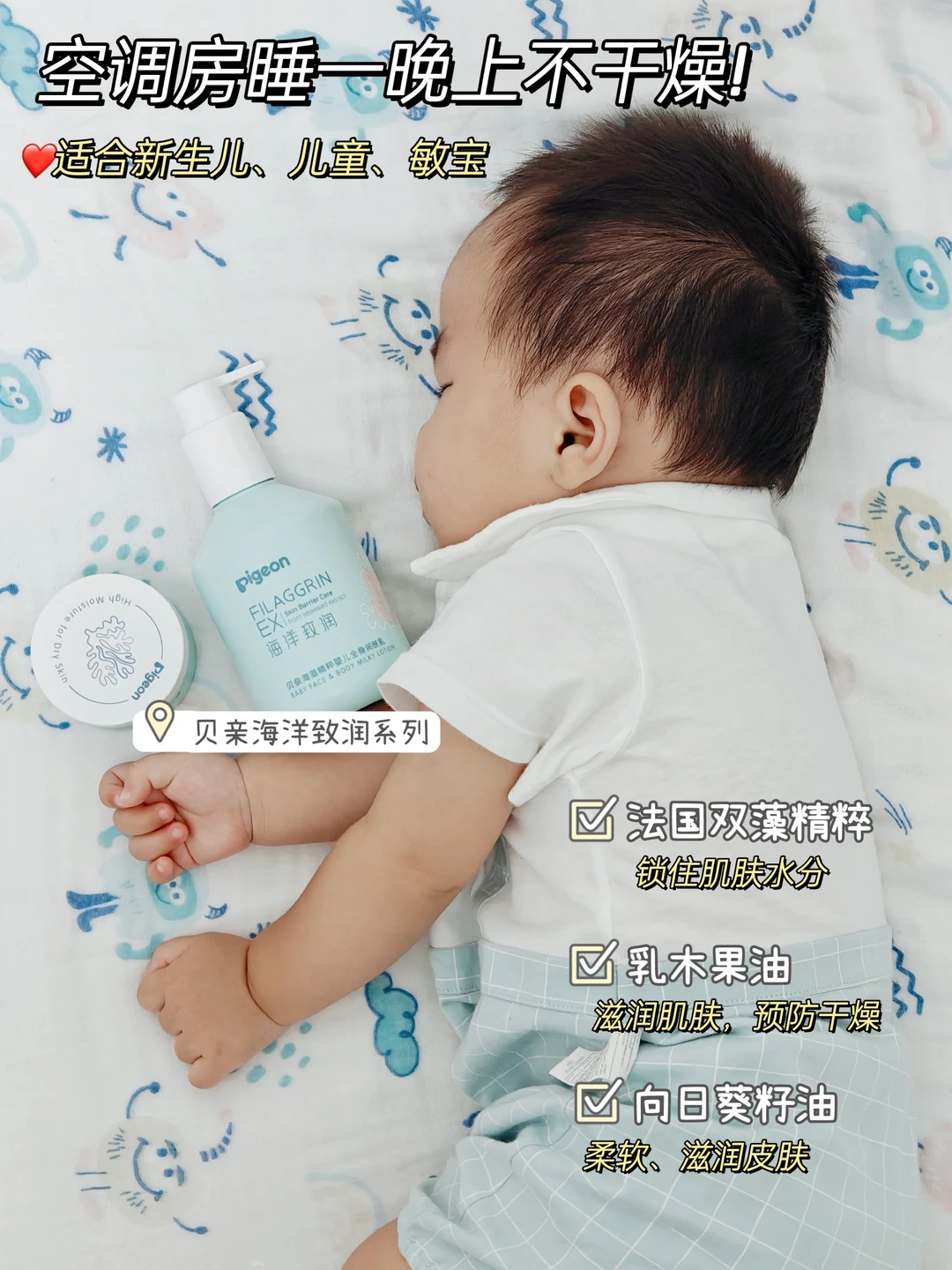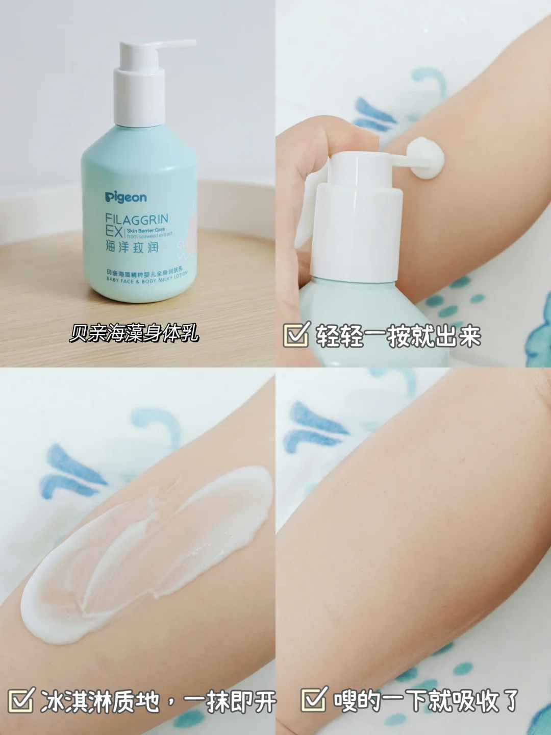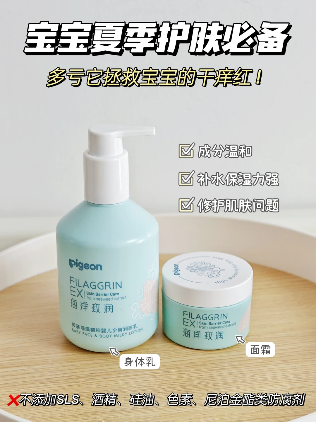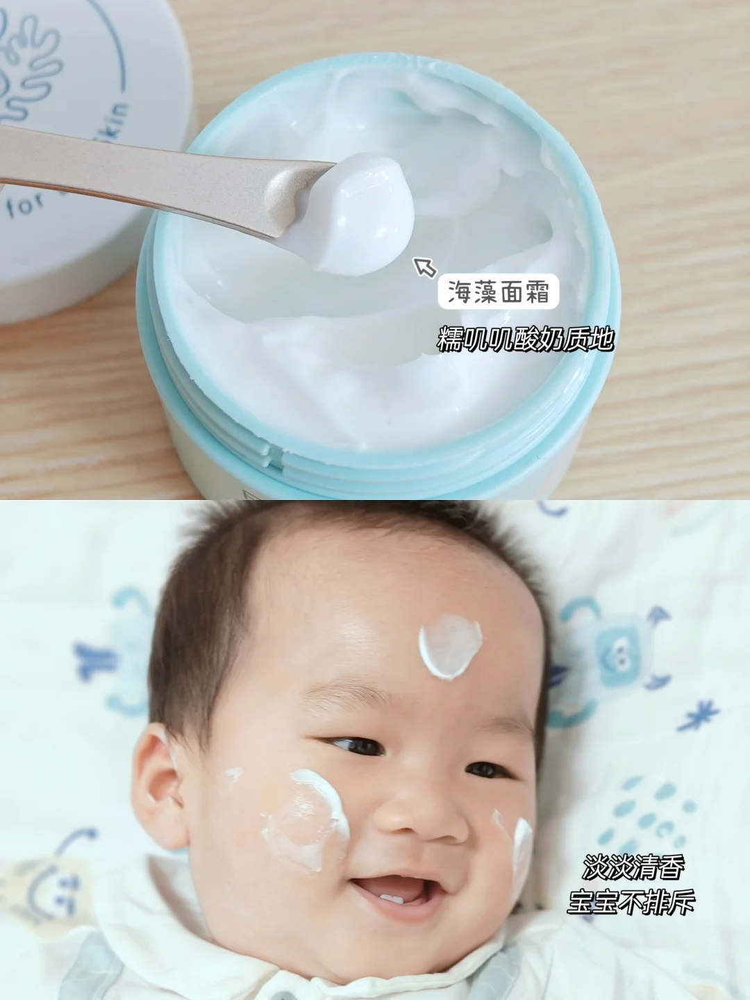 面霜和身体乳选👉成分安全、高保湿的。我家宝宝用的贝亲的婴儿面霜,保湿力够,涂脸很润,成分ok,美修全绿。没有酒精、色素、硅油、防腐剂这些,不黑脸,涂开就吸收了,夏天用ok。
