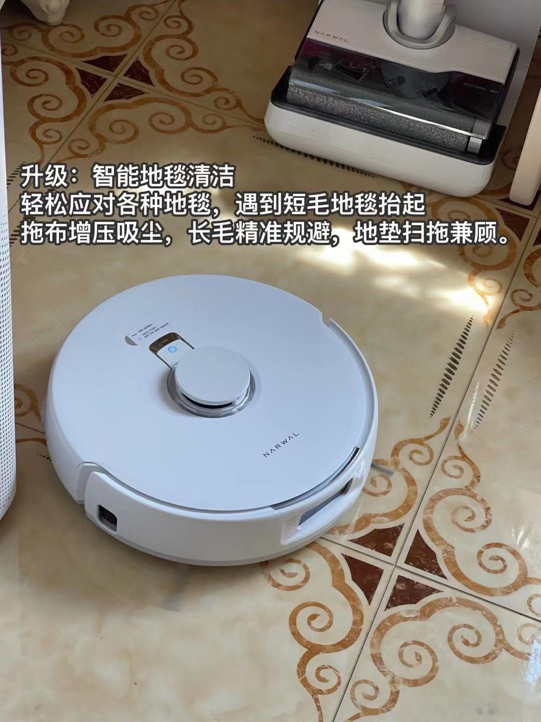 [心]升级四:智能地毯清洁,轻松应对各种地毯:遇到短毛地毯抬起,拖布增压吸尘,长毛精准规避,地垫扫拖兼顾。