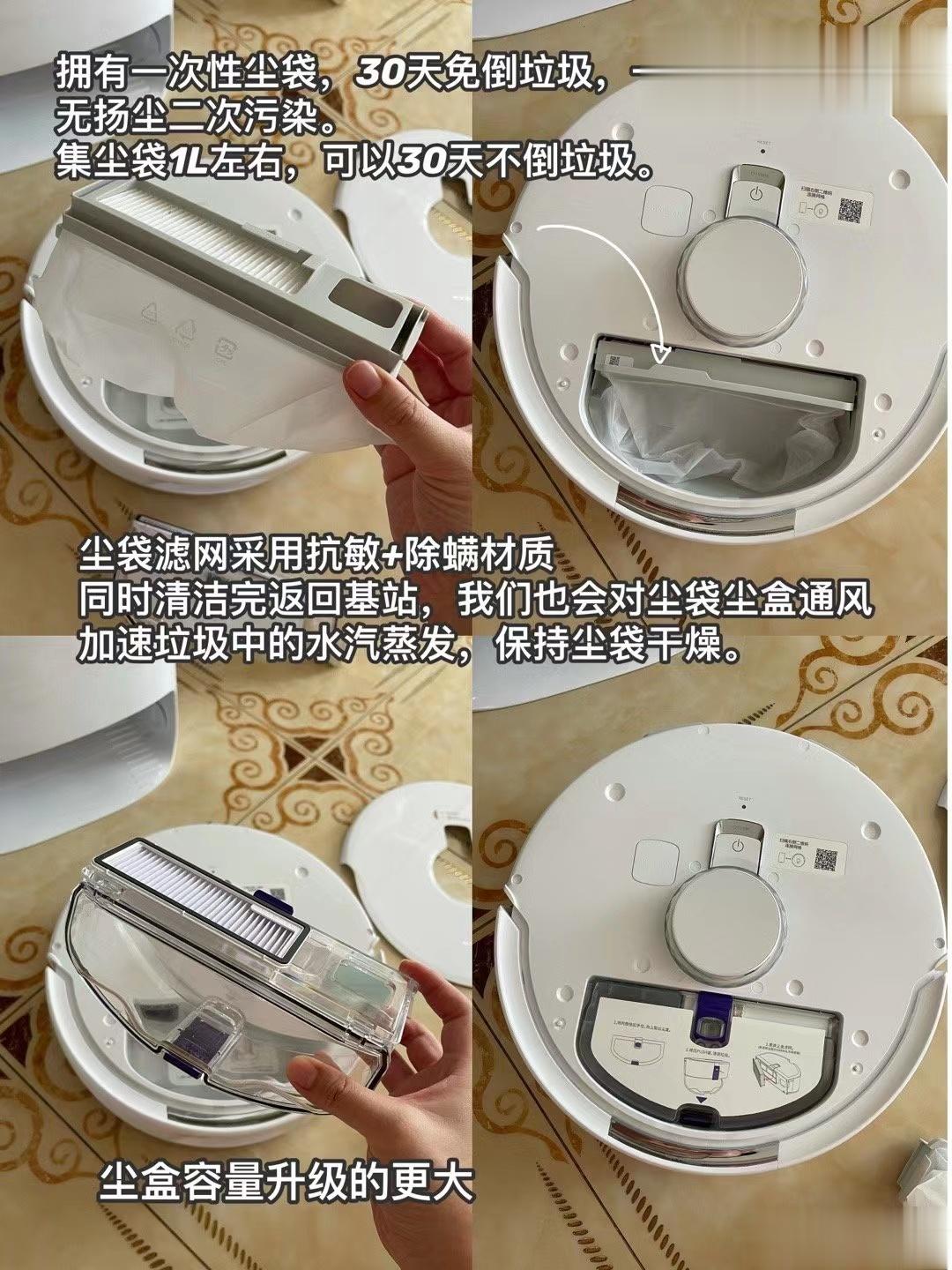 2.尘袋滤网采用抗敏+除螨材质;同时清洁完返回基站,我们也会对尘袋尘盒通风加速垃圾中的水汽蒸发,保持尘袋干燥。