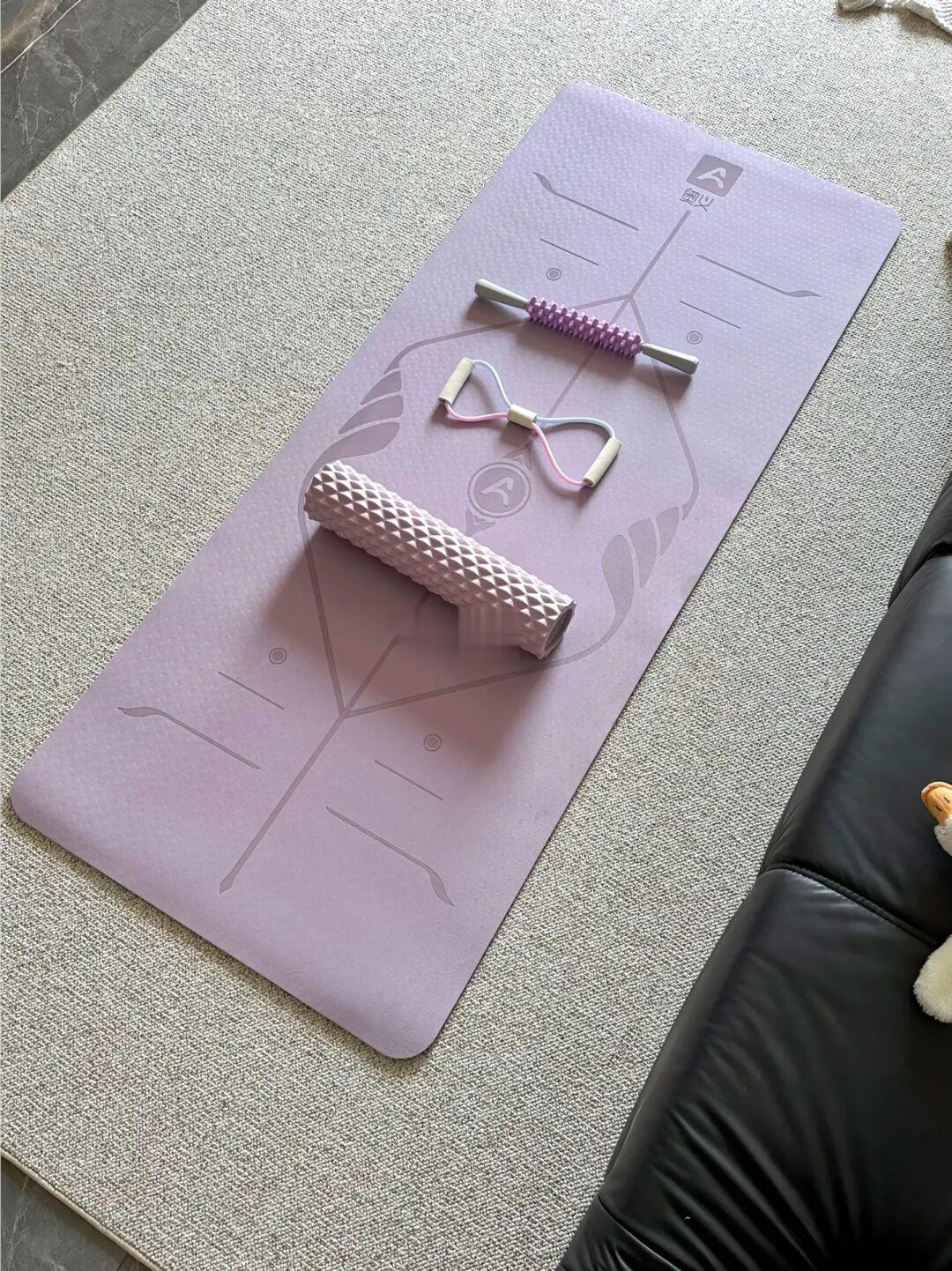 瑜伽垫正反面都有细腻的防滑纹路 tpe材质软fufu的很舒服,不管出汗还是蹦跳都不用担心会打滑